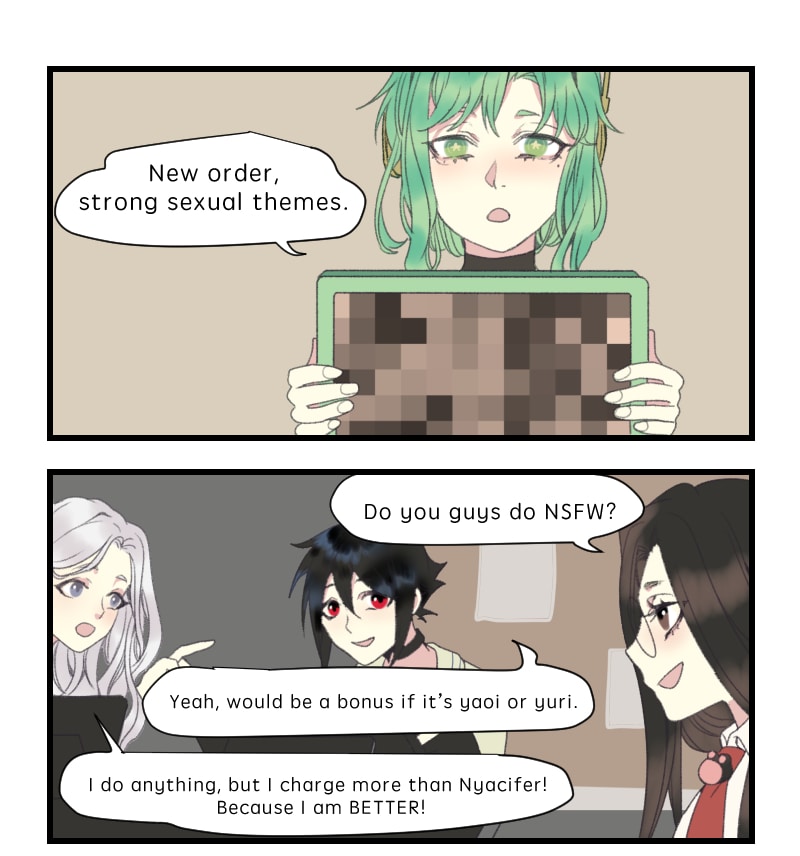 Oh I can relate to this, I also had some weird commissions, lol XD I subbed, this should be fun. You can check my comic if you want to :) https://tapas.io/series/SYNASTRY/info