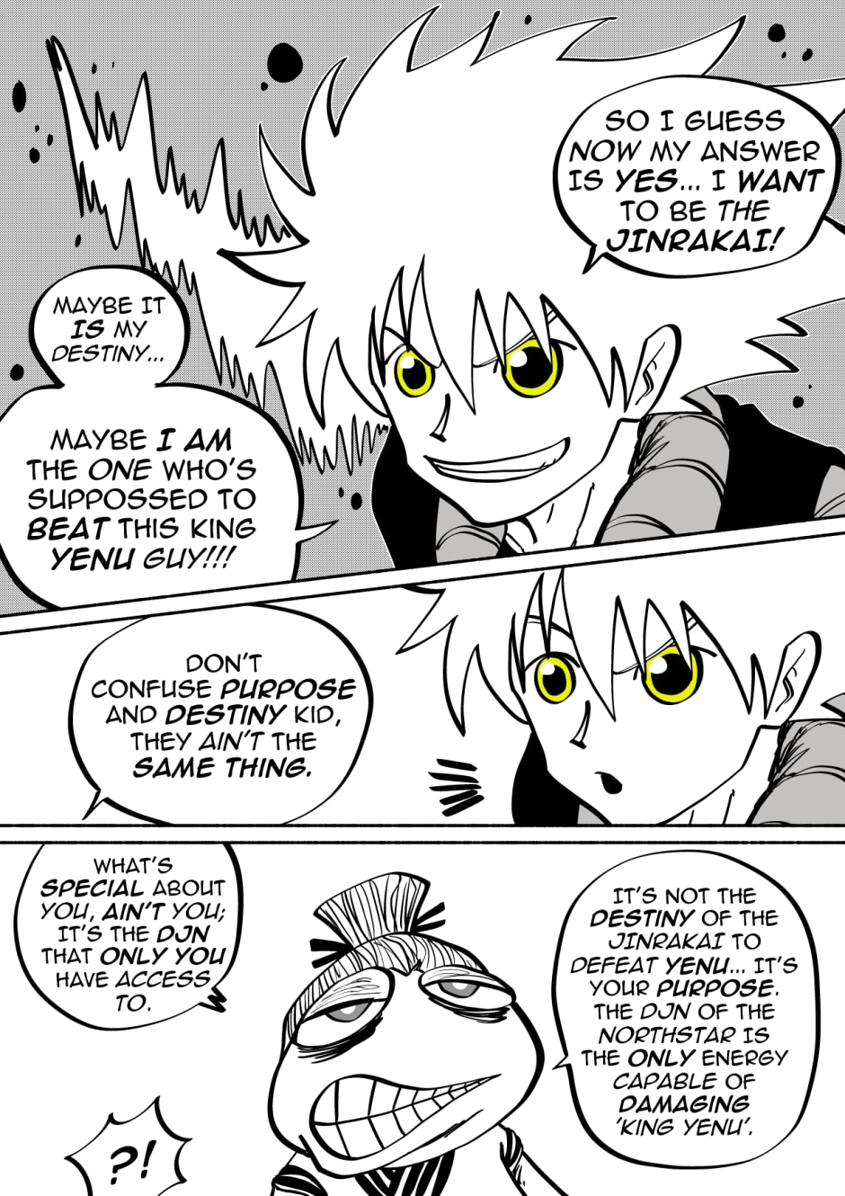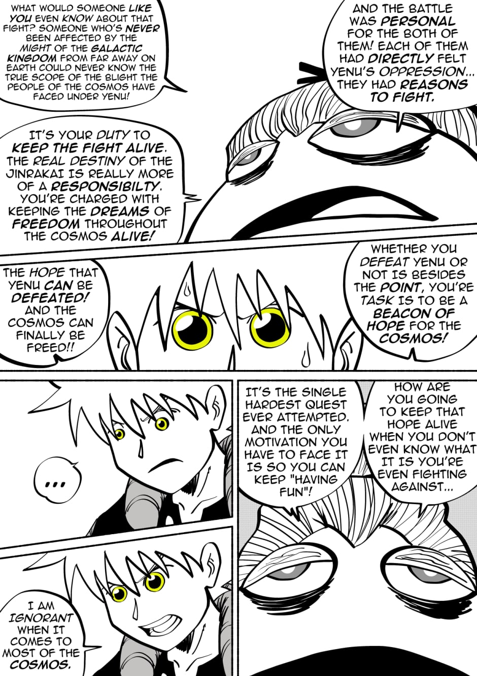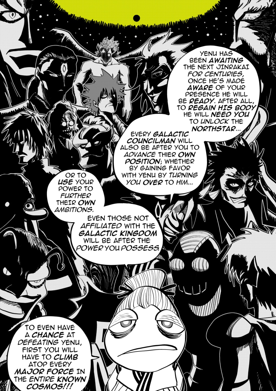 Welcome to the new space opera that is JinRakai: Savior of the Universe! Read along as Bit's peaceful life on Earth must come to an end because unbeknownst to him, Bit is actually the Legendary JinRakai!! Born with the powers of the Northstar, Bit must race across the Cosmos to the Northstar, and defeat King Yenu, the evil ruler of the Celestial Kingdom! Can Bit live up to the title of Savior of the Universe?