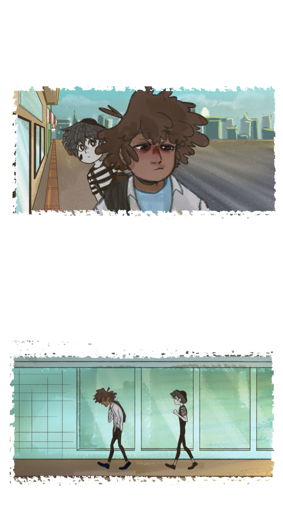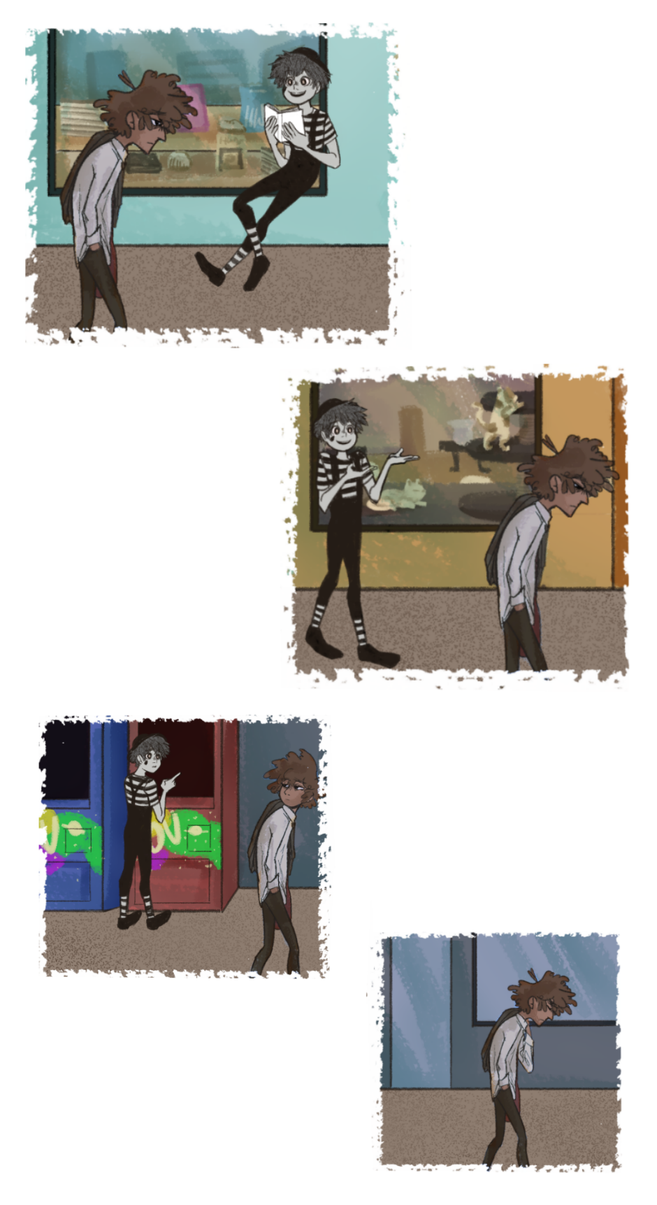 Esse amigo mímico parece ter surgido na hora que o protagonista mais precisava dele, parecendo ser o lápis de cor trazendo alegria à vida cinzenta. Mas mesmo as cores terem surgido em sua vida, ainda sim parece que existe uma quase sombra no instinto, já que feridas sempre existem.