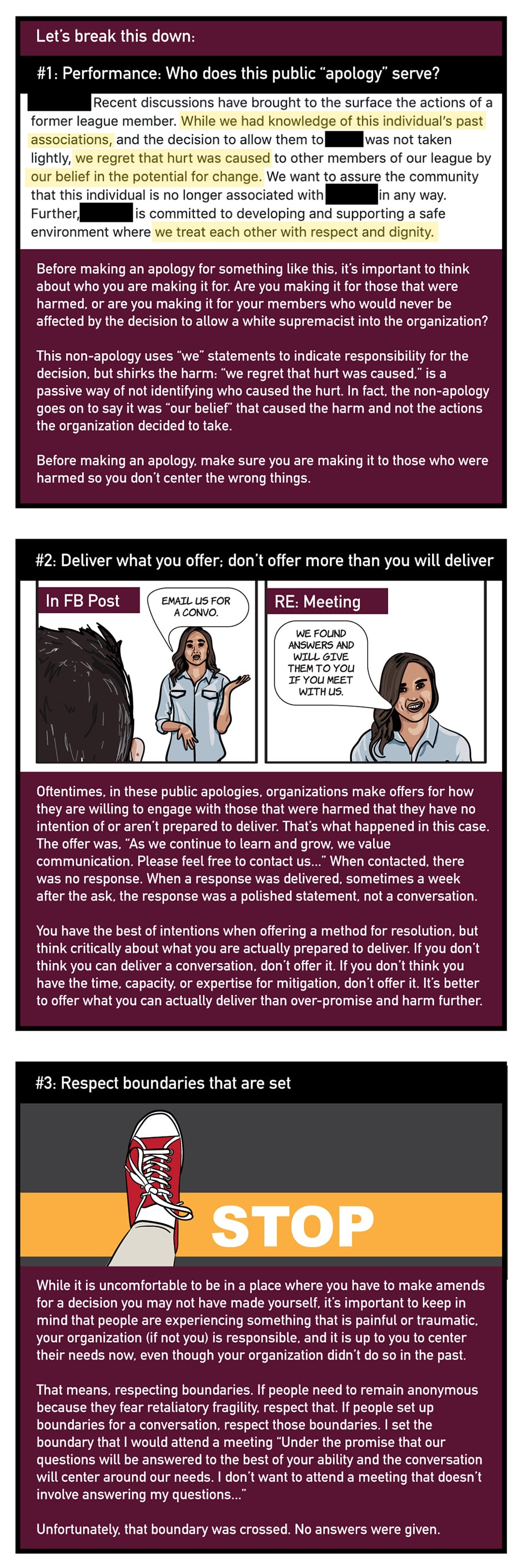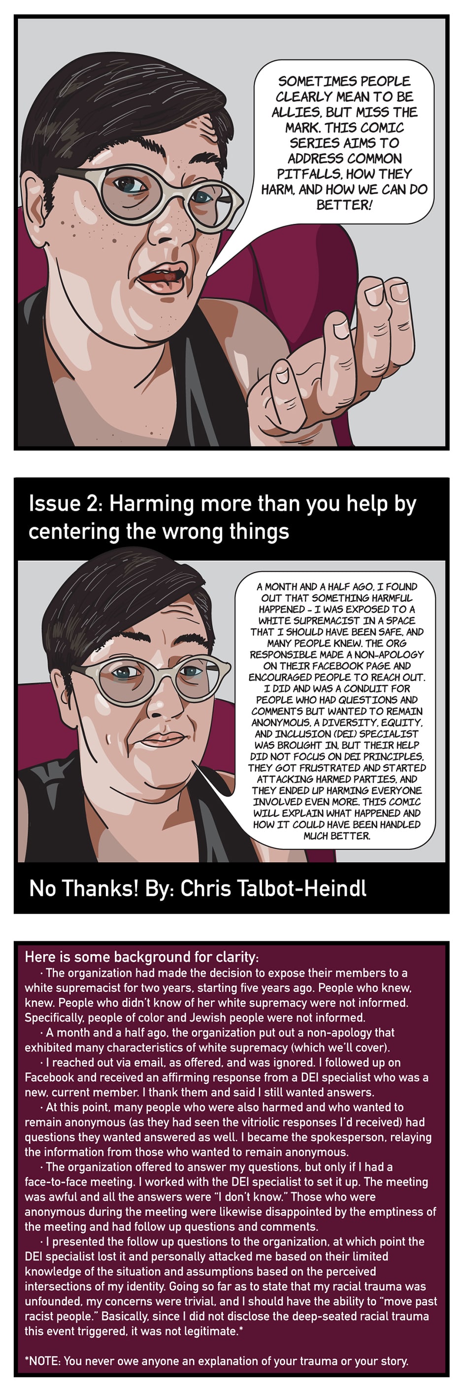 A month and a half ago, I found out something harmful happened. The organization responsible put out a harmful non-apology and doubled-down on harm all the way through the process of trying to find out how it happened, culminating in a blow-out that further harmed all parties affected. This comic will explain what happened and how it could have been handled much better.