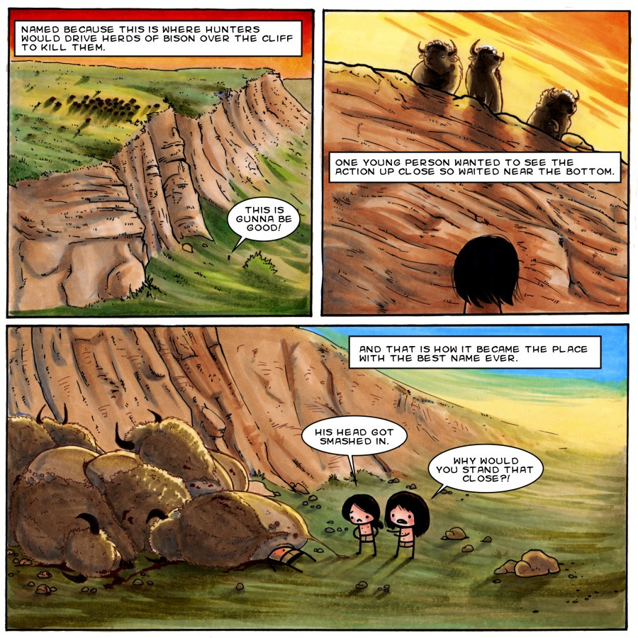 The legend says they actually didn't find the young man until they were processing all the meat and they found him at the bottom of the heap under all the bison. His head, smashed in.