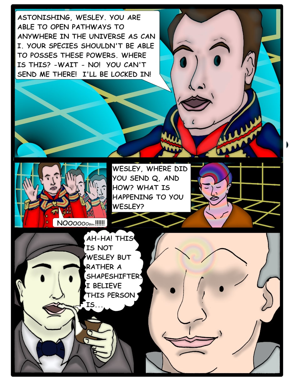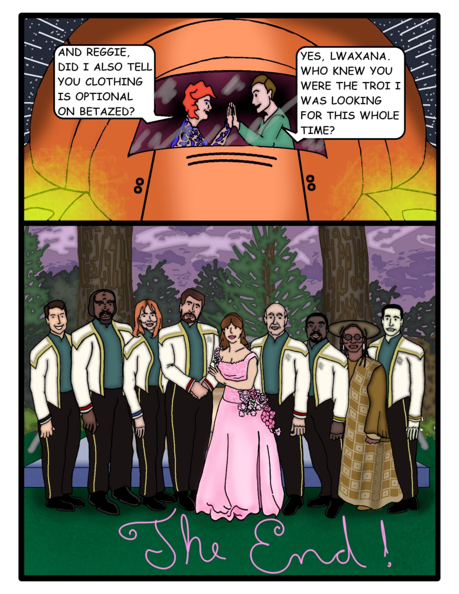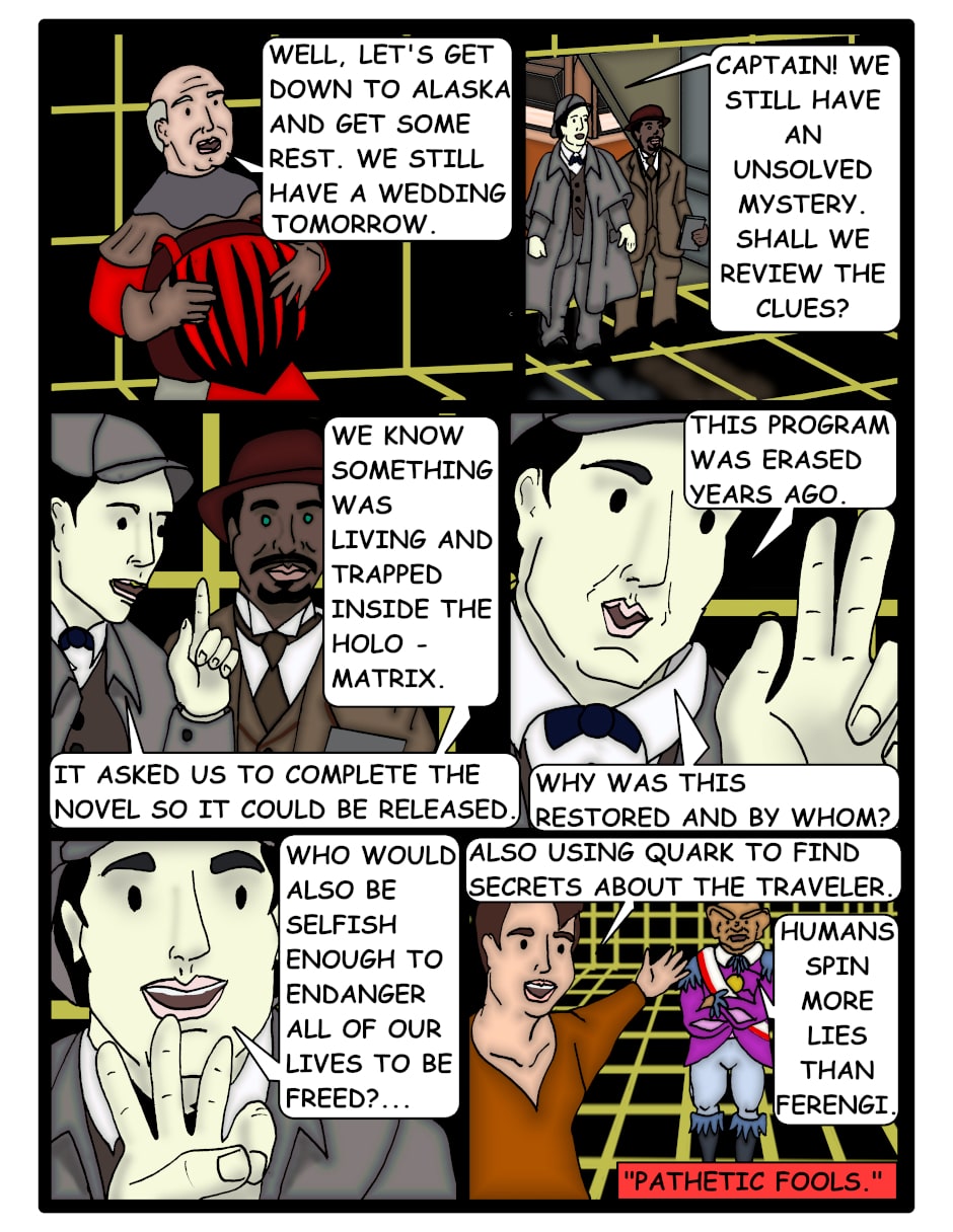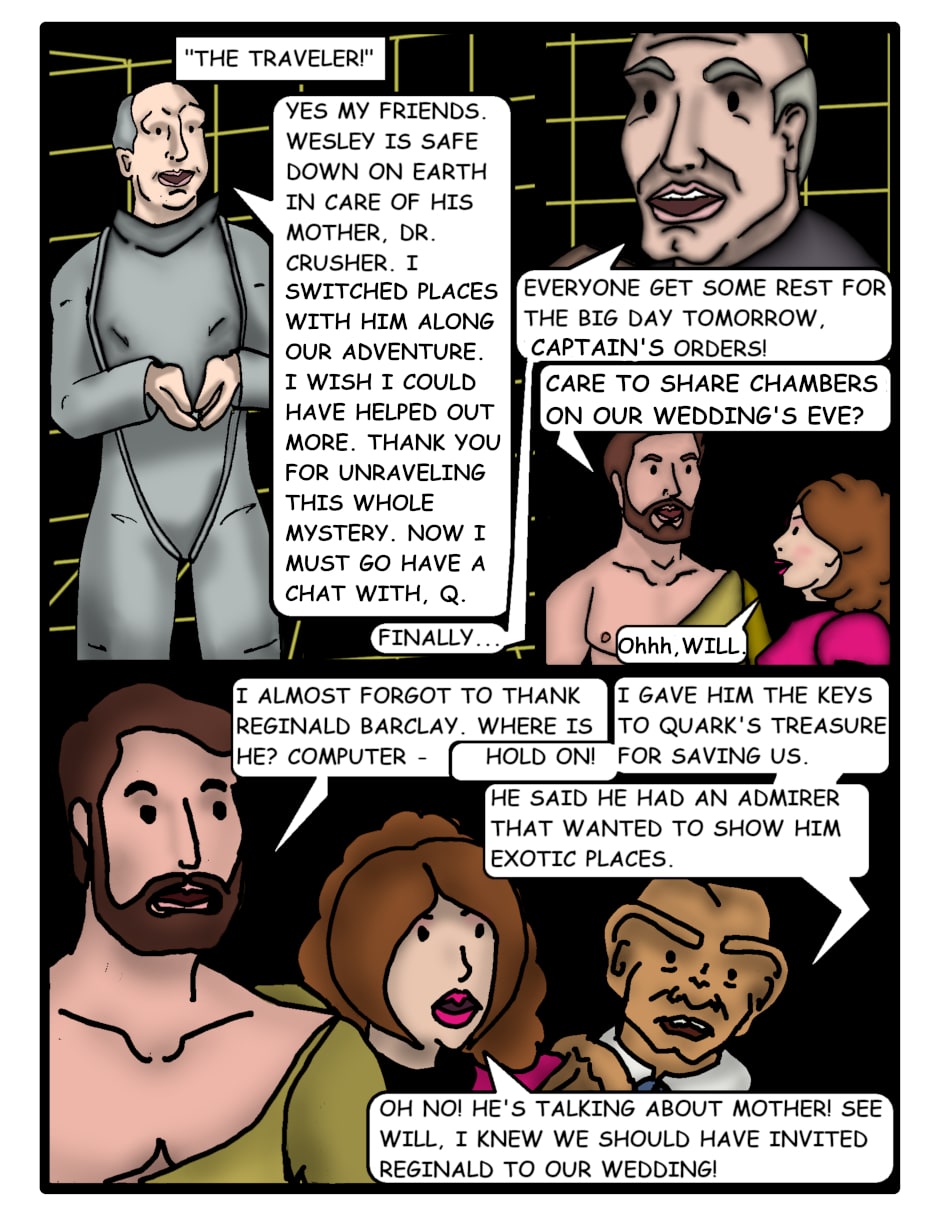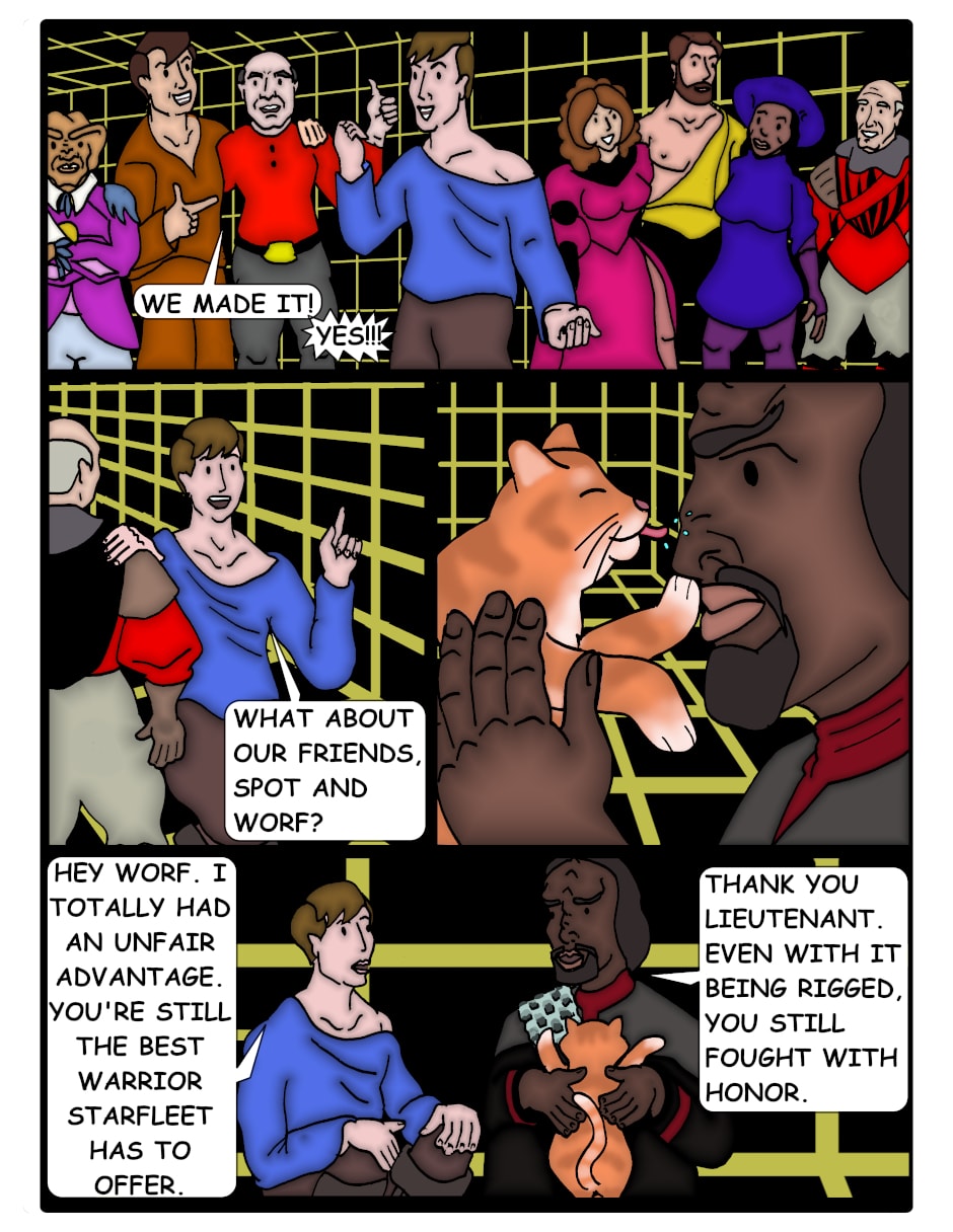 The Enterprise crew is safe and able to piece together the mystery behind the whole adventure. Everyone can then happily celebrate.