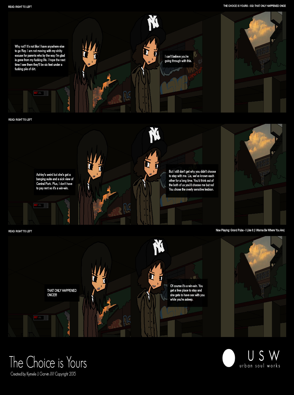 The Choice is Yours is a comic series that was originally created by Kymele Garvin in 2012 and was rebooted in 2015. The series is centered on a group of young 20-somethings and their lives between the years 1998 and 2002 in the fictional city of New Roehn.