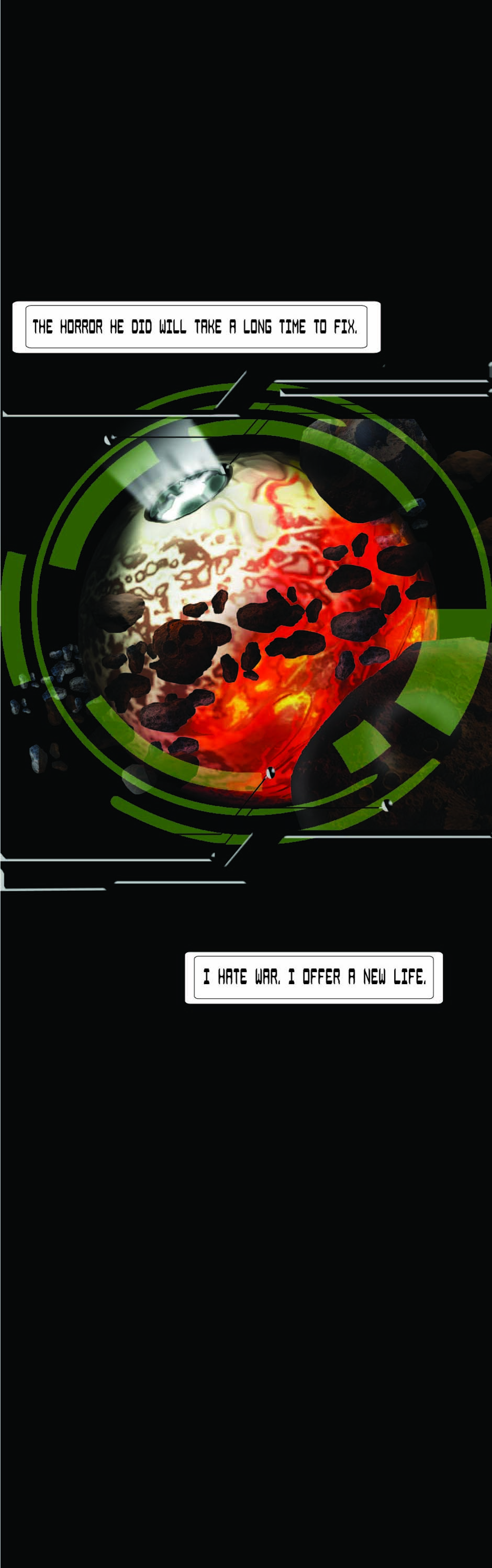Welcome to the fallen. Here you find a universe of all species. The ruins of ships and worlds orbit the planet. The planets covered in the wreckage and ruins of war. The living can never walk out in the open. Hybrid of all the space fairing species can be easily found. No one ever lives long with out cyborg parts. Some wish they were dead.