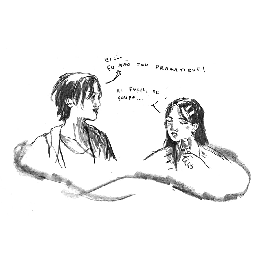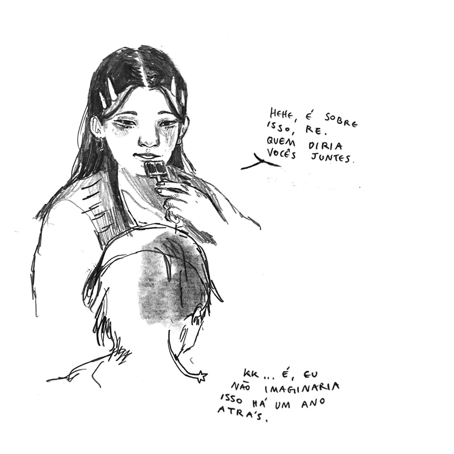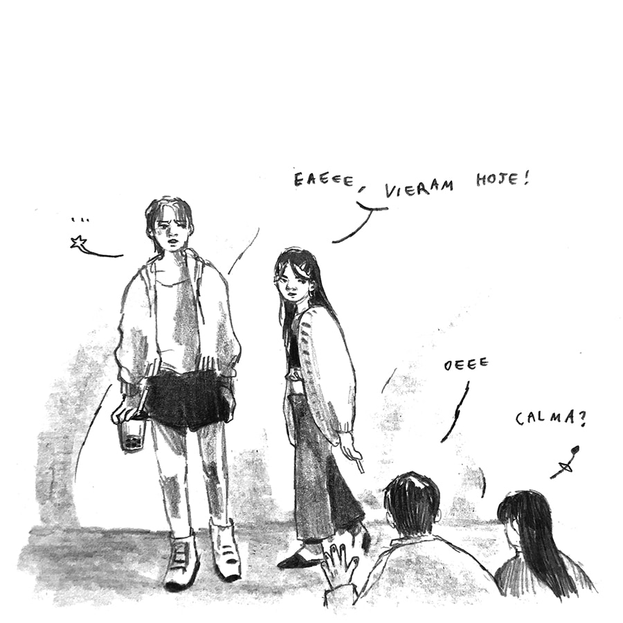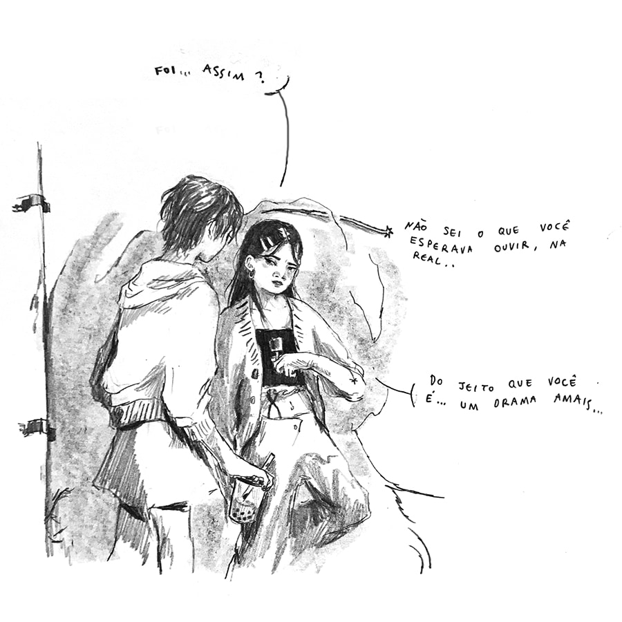 ㅤㅤAmbos os artistas percorrem suas memórias e experiências do pertencer e do afetar vividas por pessoas racializades LGBTQ+; tanto pela falta como pelo desejo. De um lado, o personagem Cleo, criado por Gustavo, revisita sua cidade natal, onde anda pelas memórias que formaram sua identidade. A cidade interiorana traz memórias ambíguas tanto de conflito quanto a do seu primeiro amor. De outro lado, Re, protagonista da história de Patricia, revela-se em um romance com uma amiga, desafiando conceitos de fala e expressão que aprendera até então.