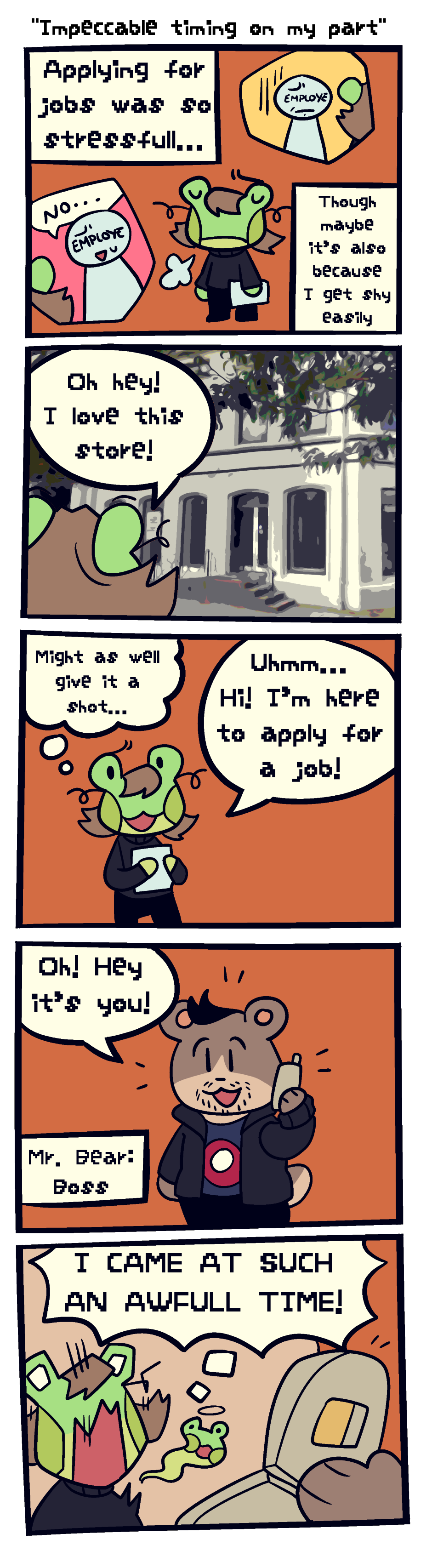 Follow my journey into working in retail! Getting along with co-workers, dealing with tricky customers, cleaning and helping out! The Frog Log shows me both at my best and my worst... Can this cute little frog survive the harsh world of working at a comicbook store? hopefully! (Co-workers are named after/modeled after animals to protect their identity)