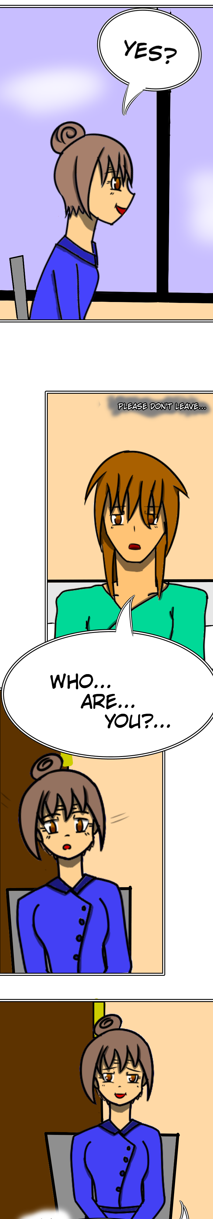 Questions over question in this dark abyss. "Who are you?", he asks. She looked back at him. Her bright smile slowly faded as she stared at him dead in the eyes. She took a step back and ran away.