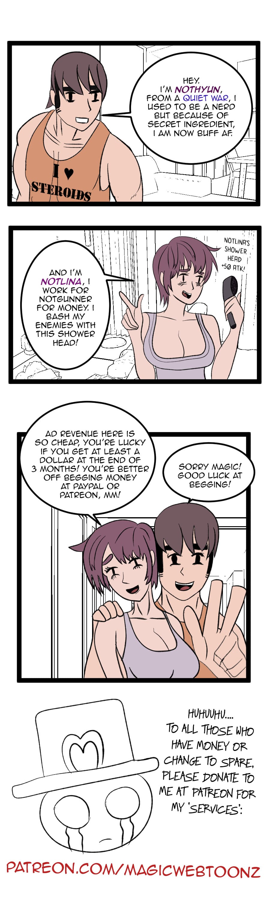 A series of gag comics made by a guy named Magicman. Often he makes mature jokes and even parodies. Ultimately, he just wants to make money out of all of this. Will he gain an army of followers regardless? Meh, his drawings suck.