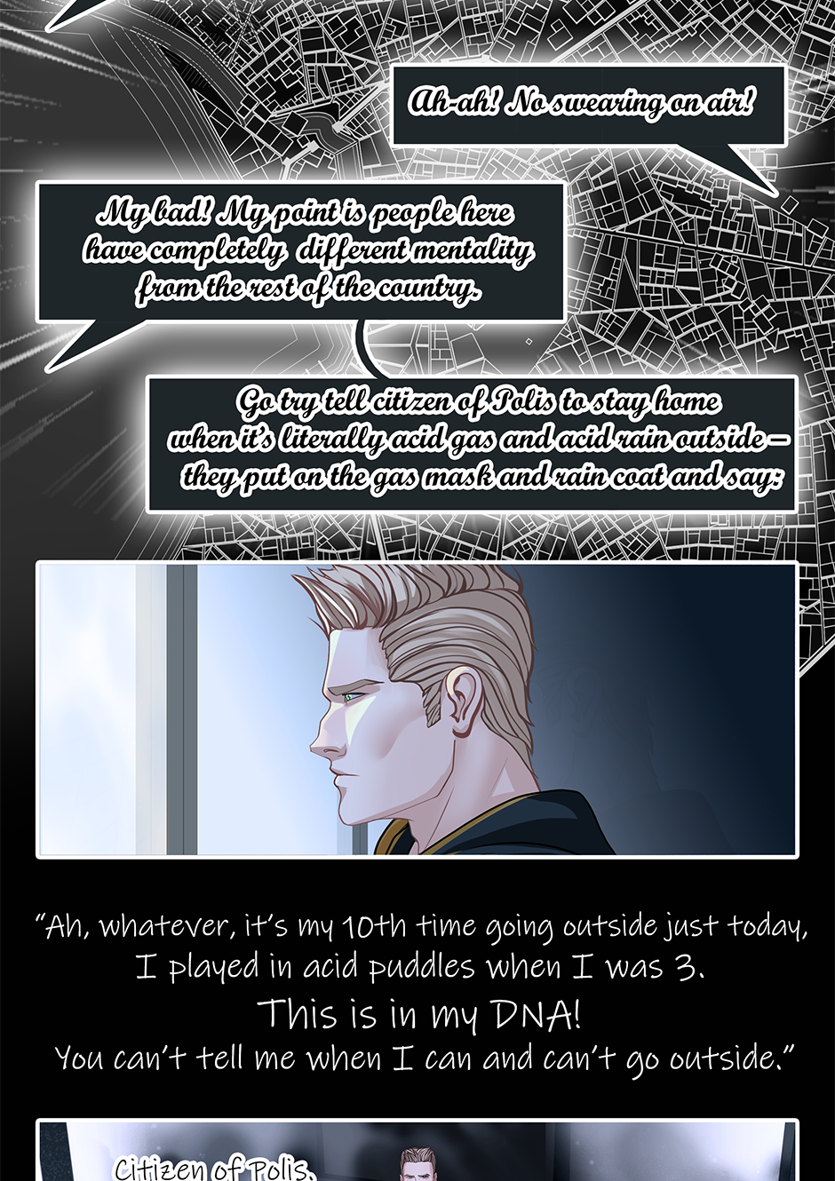 It's not nice to know other cities use your home town as example of place with obnoxious non-obeying people who risk their lives... Also remember I told you they are not living on Earth. :) Here we go, acid rains/vapor in Polis sometimes and quarantine in Deep Barrier.