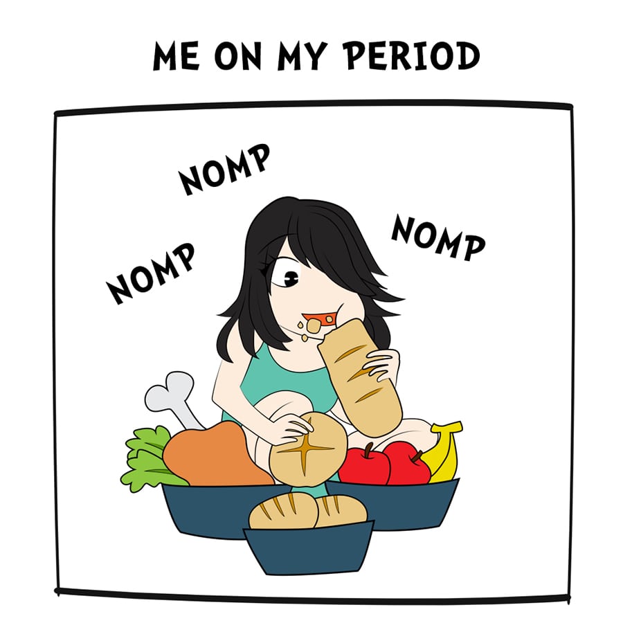For the few days before and during my period, I'd turn simultaneously into both Godzila and Eating Machine. Usually will be followed by crash dieting for 3-4 weeks just to repeat the cycle all over again :')