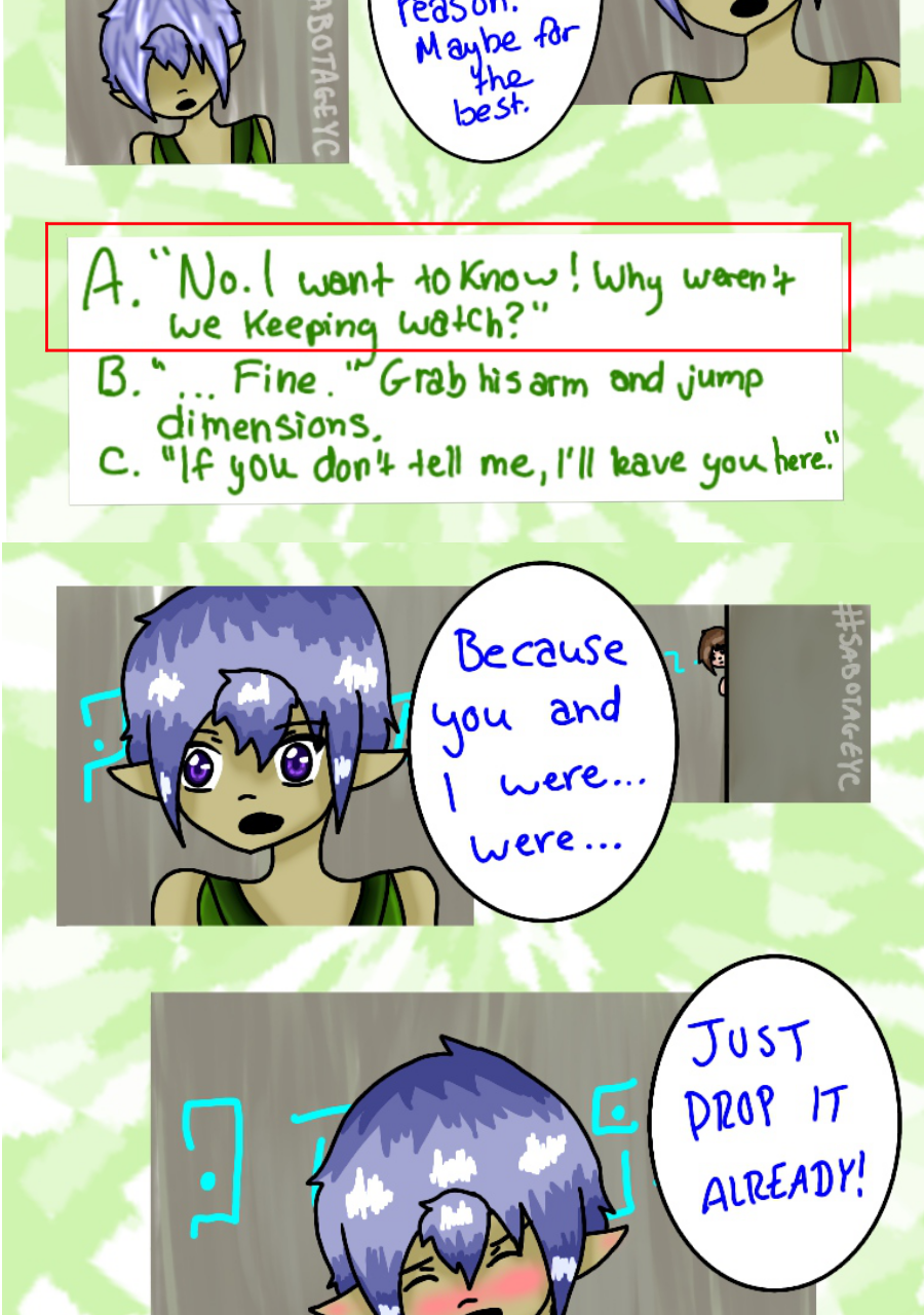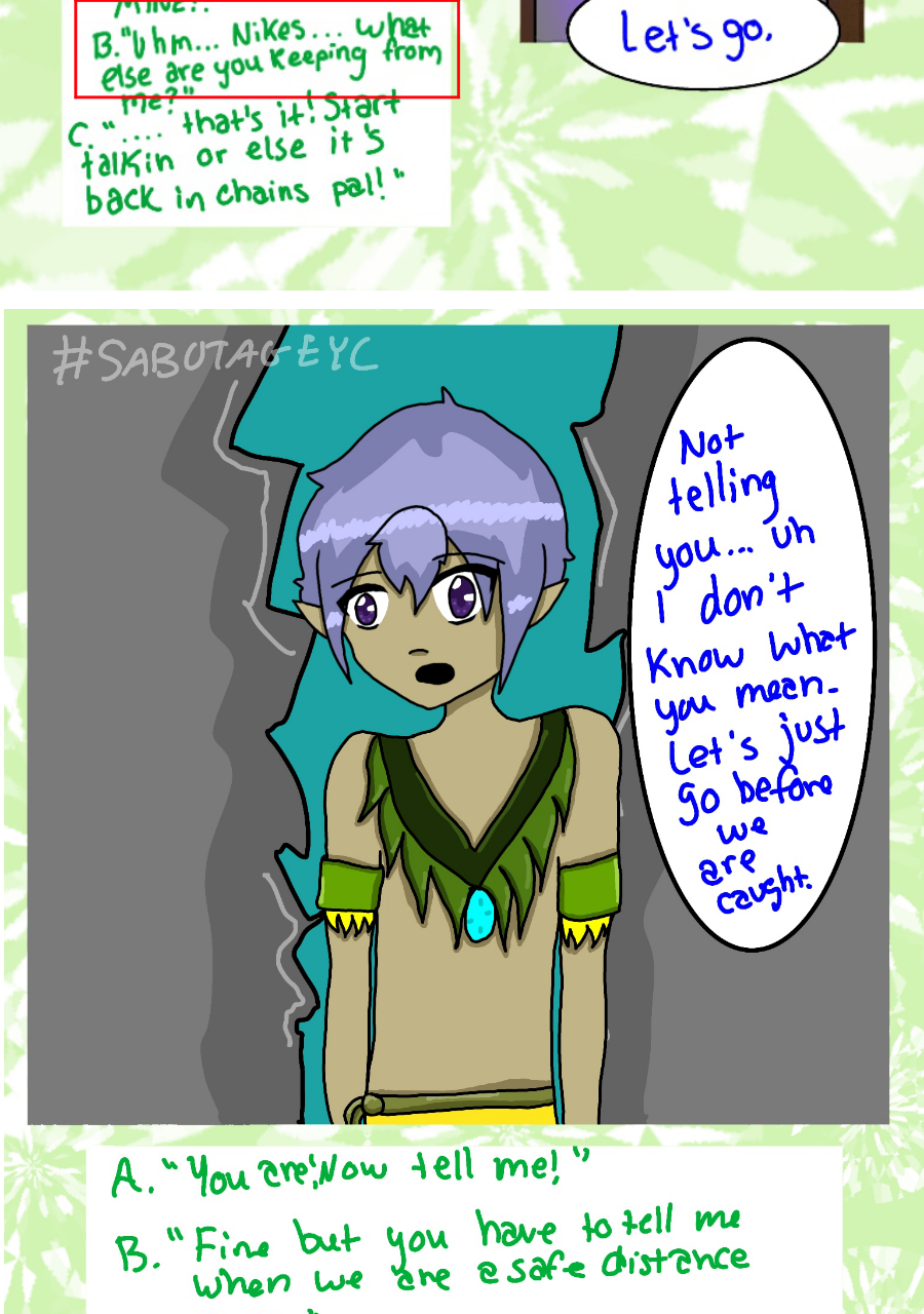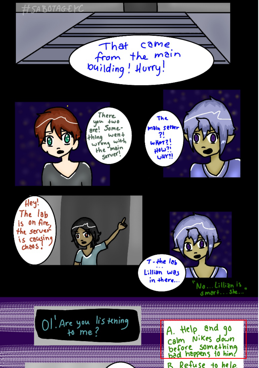 Continuation of a comic known as SabotageYC, previously known to be a 'choose your own adventure' comic on the site Paigeeworld, which has since shut down, but now has turned into a normal comic. These pages are placed here for readers to continue reading this comic as well view the beginning.