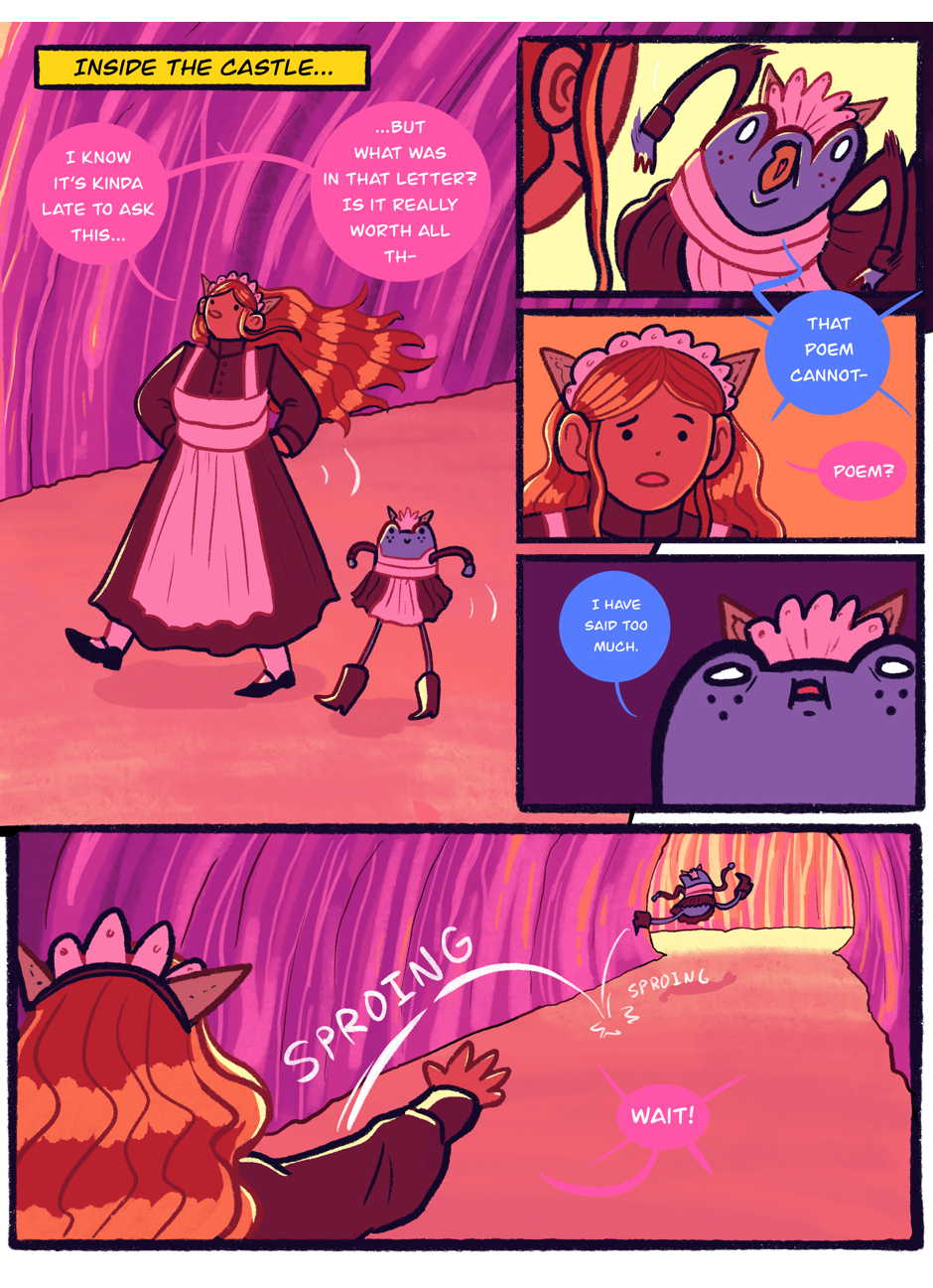 Frog Prince is an anxious froggy adventurer and diplomat! Human Peasant is a laid back girl with a passion for fashion, cute things and punching stuff! Join this gay little frog and his lesbian friend as they brave fashion shows, treasure hunts, competitive compulsory romance, and all manner of adventure with their many friends!