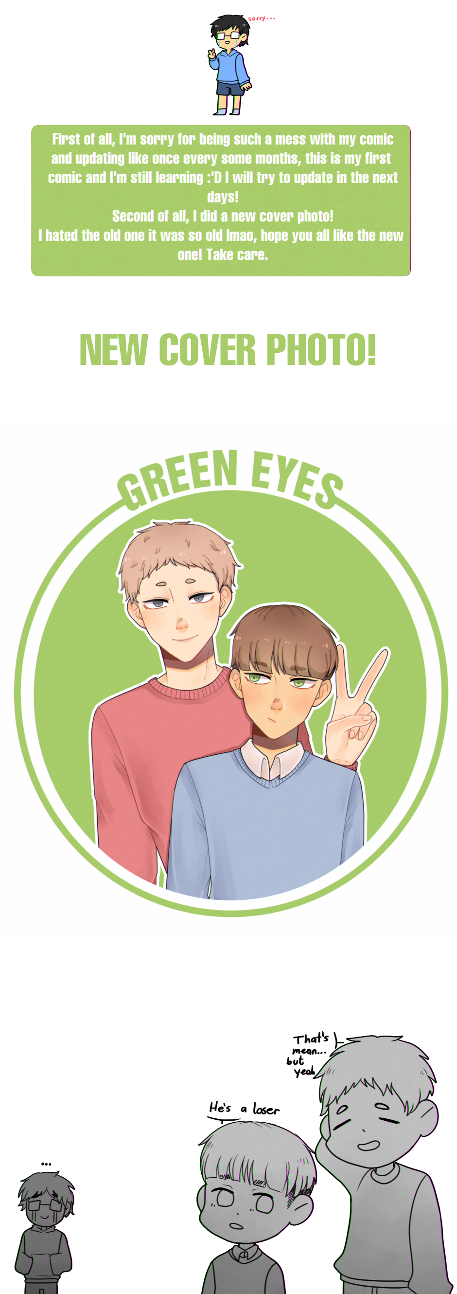 A comic about a big-hearted dorky boy that just can't stop thinking about those green eyes.