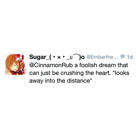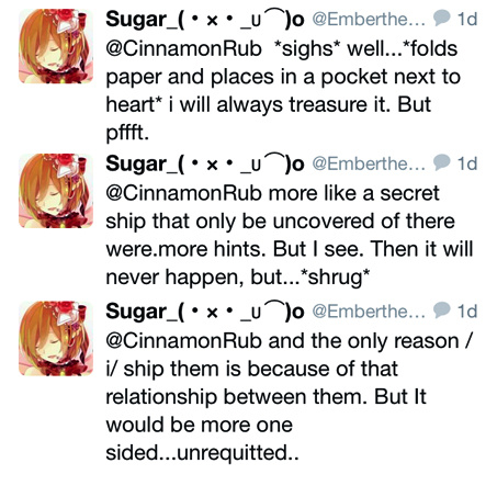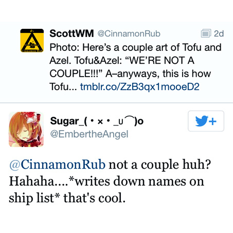 Yea, you can interact with my MEATSPICE OC's. Here's one with twitter's EmbertheAngel. :> If you have any questions for them, shoot them at the thread on my profile page.