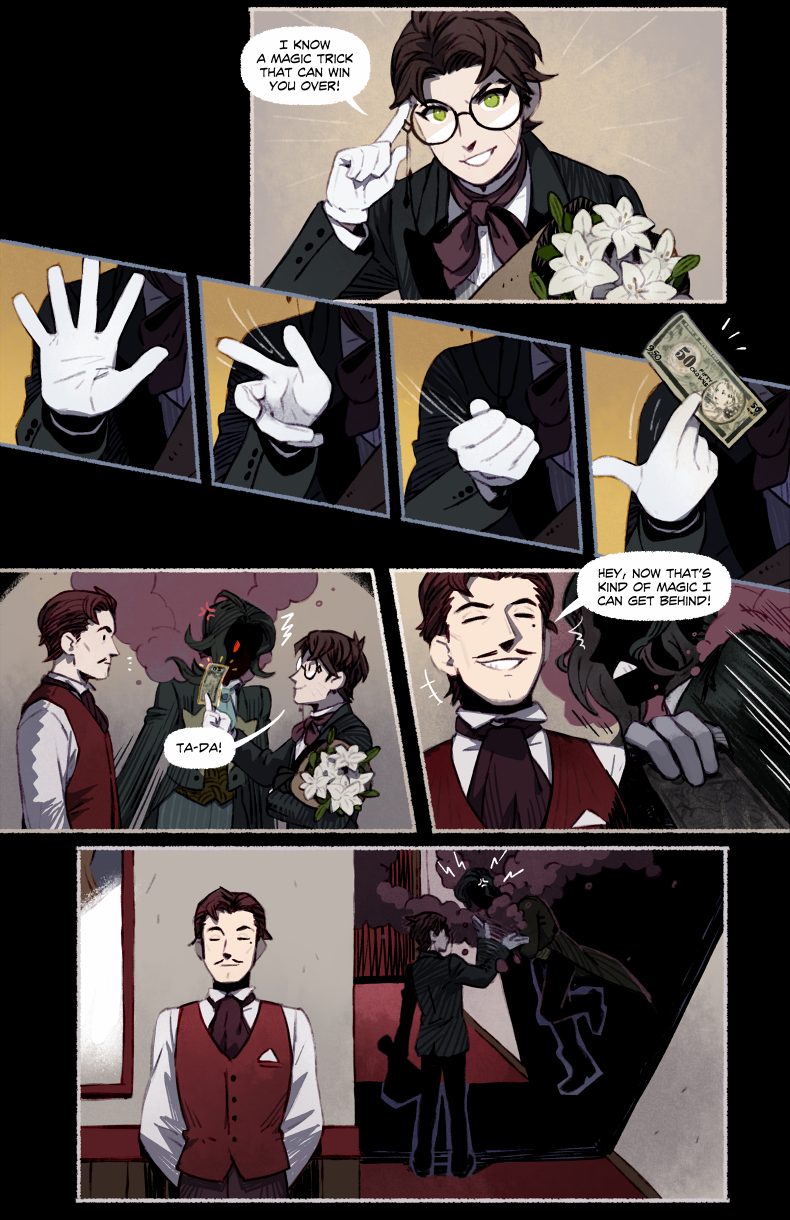 HAYDEN’S NOTES is a magic realism mystery with horror elements, set in the fictional country in the first half of the 20th century. The comic’s told in the non-chronological order revolving around Hayden Carter, immortal (by accident) gray mage, pursuer of knowledge and a witty nuisance for everyone around.