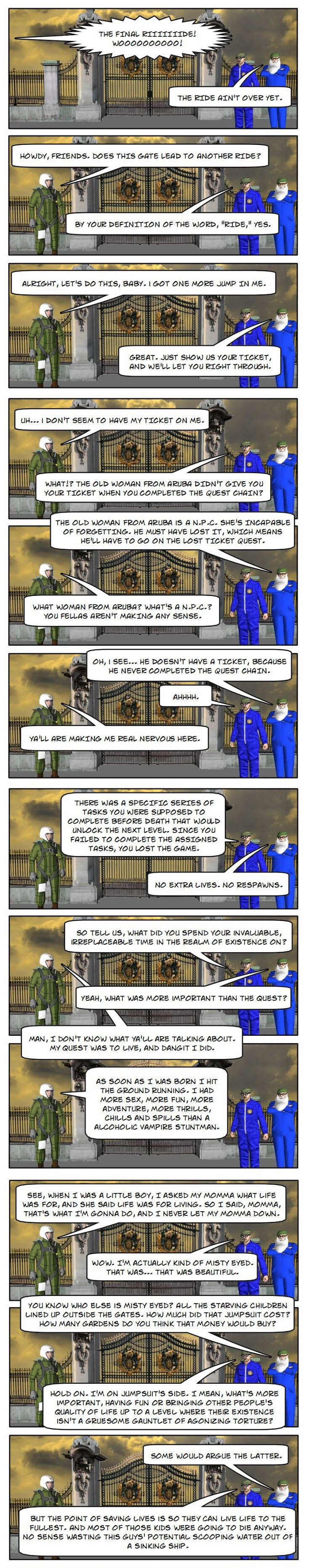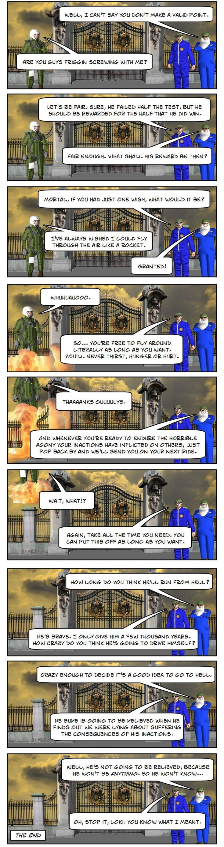 Loki taunts a recently deceased hedonist at the Pearly Gates to the afterlife.