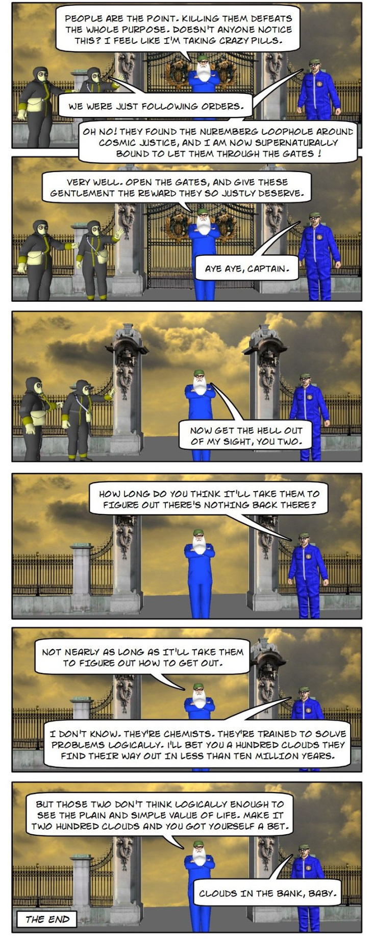 Loki taunts two recently deceased martyrs at the Pearly Gates to the afterlife.