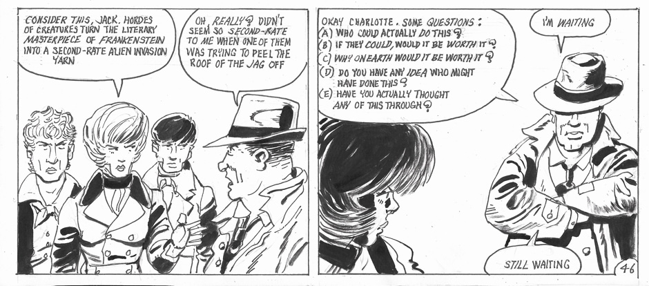 On occasion, she has been accompanied by a human-sized “Muffin the Mule” entity which had its origins in a strip Keith did for IPC’s Revolver many years ago. Her stories are written and drawn by Keith Page, sometimes also by Stephen Walsh.