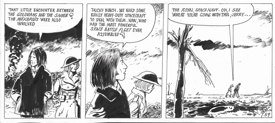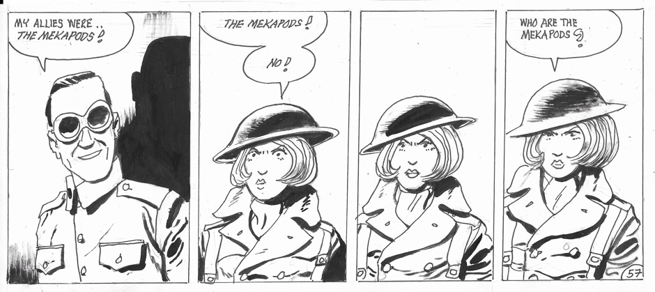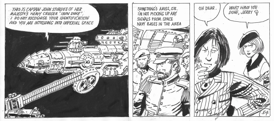 On occasion, she has been accompanied by a human-sized “Muffin the Mule” entity which had its origins in a strip Keith did for IPC’s Revolver many years ago. Her stories are written and drawn by Keith Page, sometimes also by Stephen Walsh.