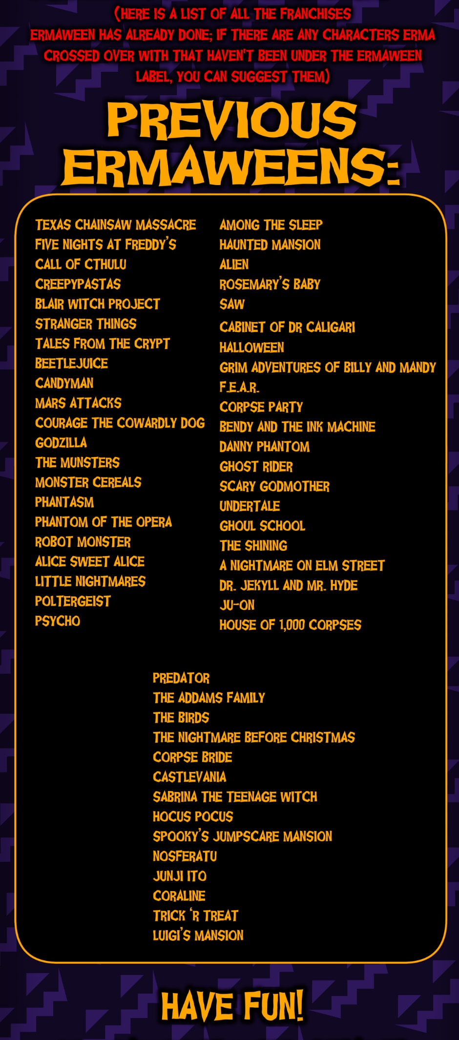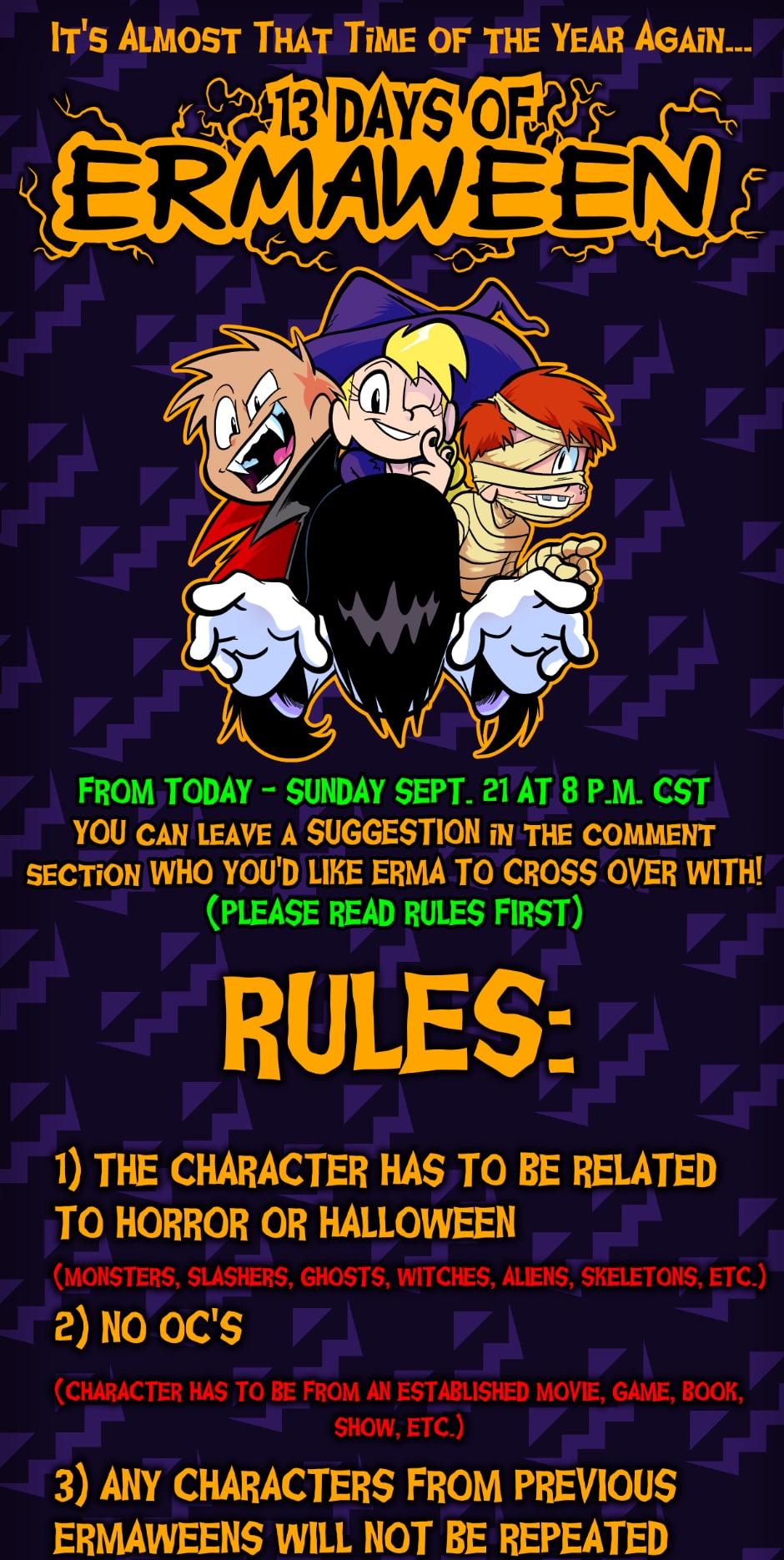 October is near and that could mean one thing... we are taking suggestions for ERMAWEEN 2020 until Sunday! Let us know who you’d like Erma to meet. ERMAWEEN will begin on October 19.