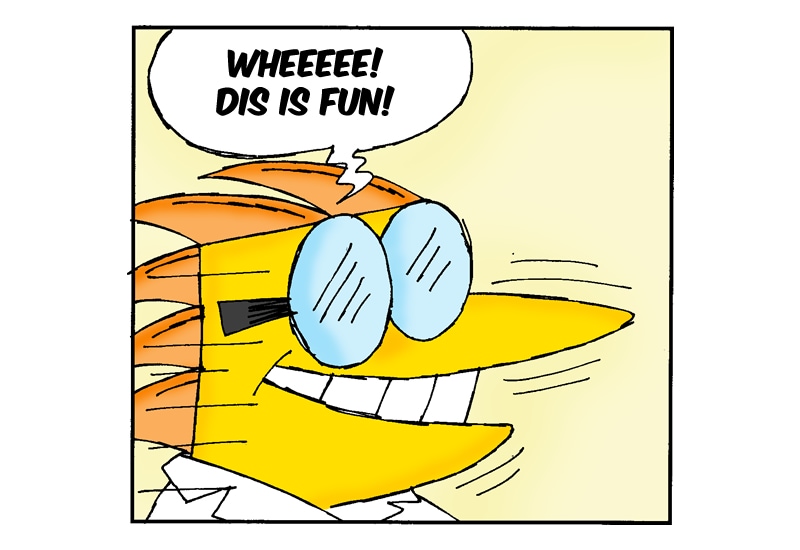 Zorr (Stegosaurus): The Design Junior. Pretty smart for a stegosaurus but very clumsy - especially when he loses his specs. He always ends up being the 'guinea pig' in Des and Einer's experiments, probably explaining the reason for his frighteningly bad temper! Eating and sleeping are his favourite past-times. He also tries to rival his brother by playing accordion... badly...