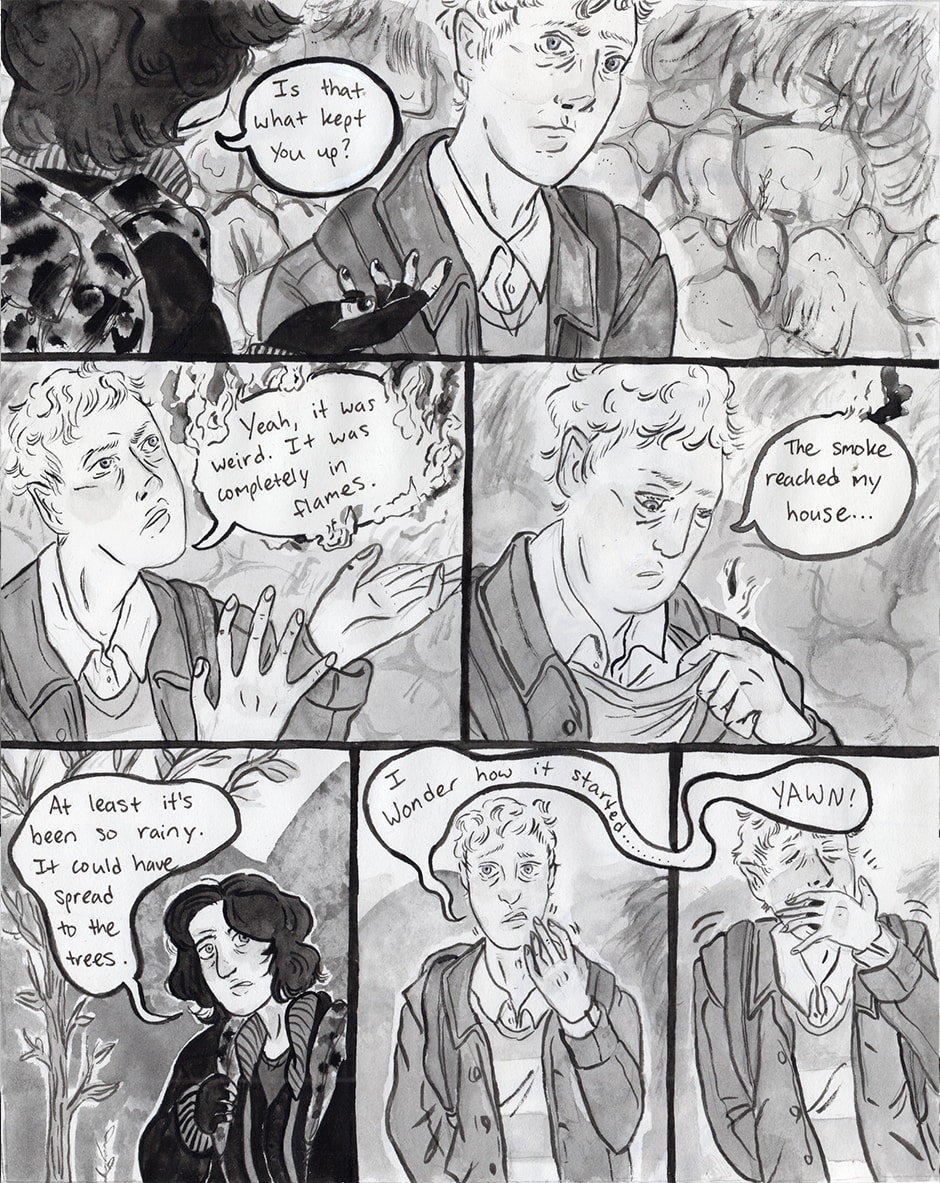 Andrew has narcolepsy with cataplexy. This comic is about his daily life, and how he manages his condition. Specifically, It details the odd series of events that took place in his life in the weeks leading up to a spring storm. Arson, smoke, nightmares, power-outages, ghosts, and a mysterious stranger who hides under his balcony at night, whenever it rains.