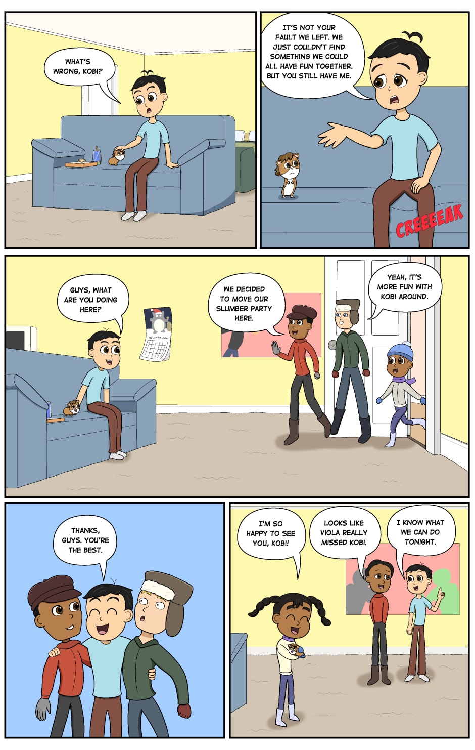 Chion and Kobi is a slice-of-life webcomic about a boy and his pet guinea pig. The story is set in Pinetown, a fictional Maine town close to the Canadian border. Chion Minami is a fun-loving and carefree 12-year old boy whose life takes a new direction when he adopts his new pet guinea pig, Kobi. With Kobi at his side, Chion broadens his scope during his transition to teenhood. Follow Chion and Kobi on their adventures as they bond with their friends, face life's challenges, and embark on journeys through the forests of Maine to the big cities of New England.