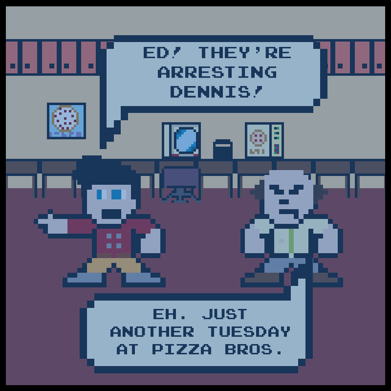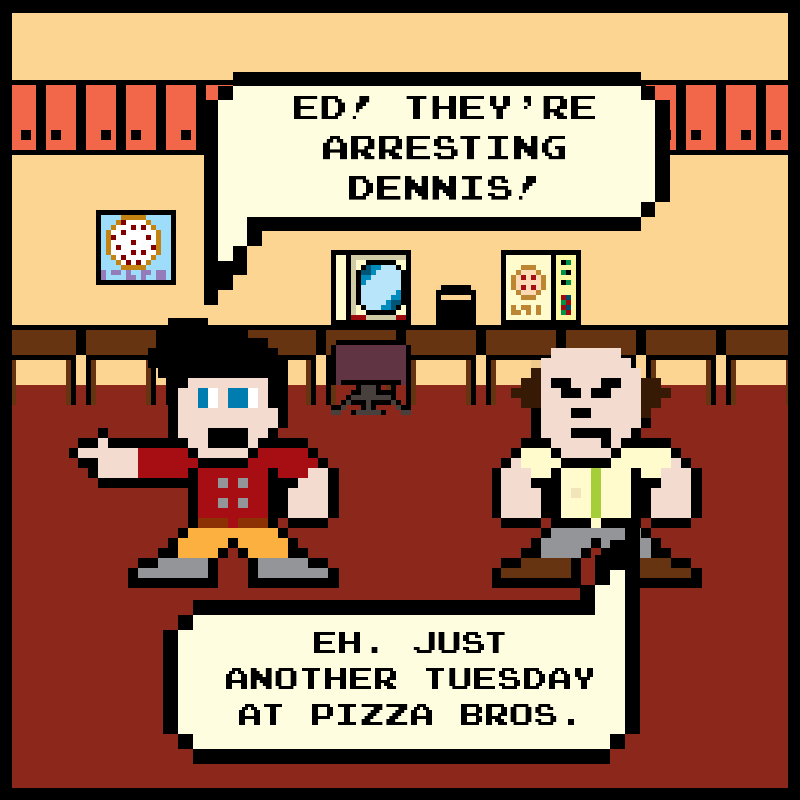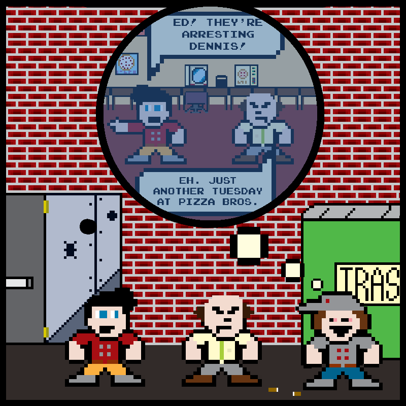 At Pizza Bros, the shit rolls down hill. Join the Pizza Bros crew as they fight their way through dinner rushes, pain in the ass customers, awkward situations, ruthless yet strange competition, and insane upper management. It seems like a recipe for disaster, but some how the crew at the Pizza Bros Chesterwood store keeps slinging the dough.