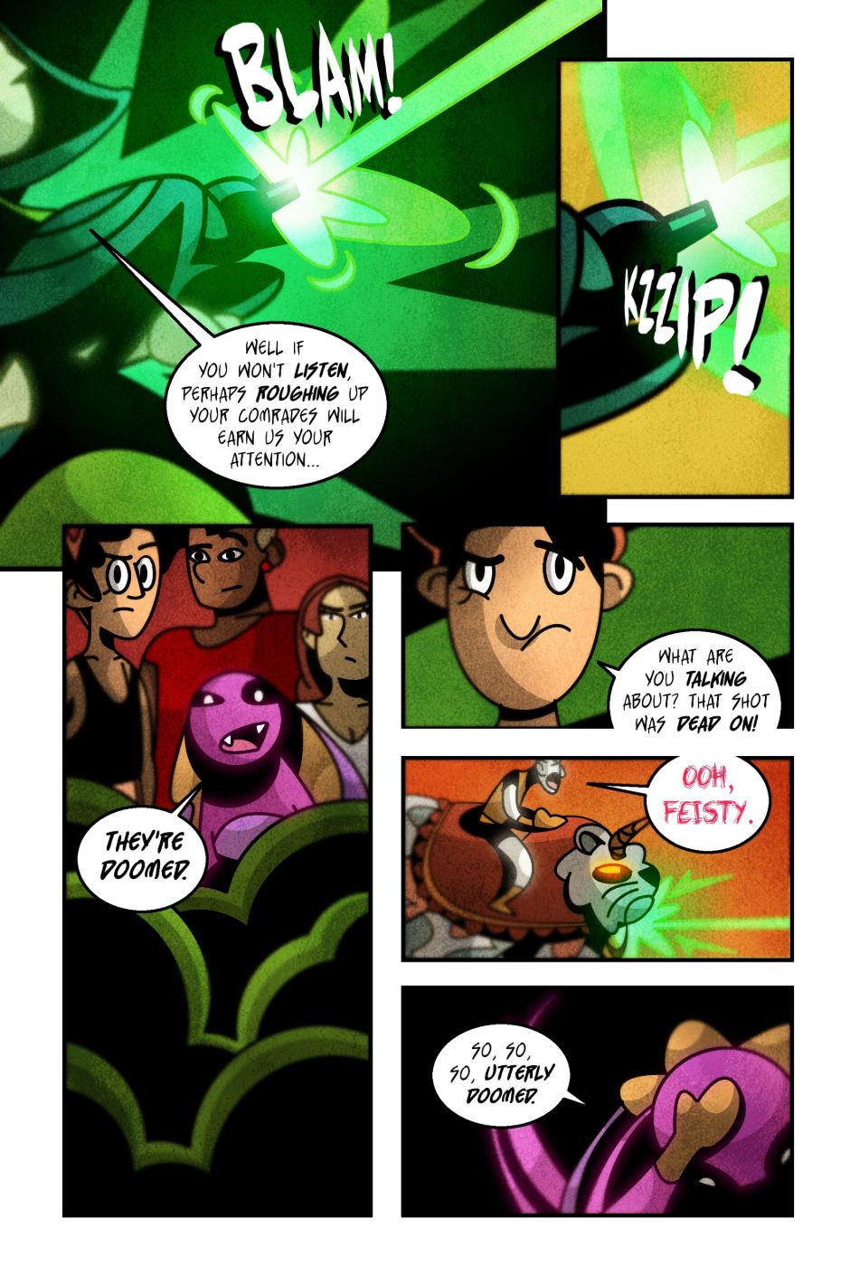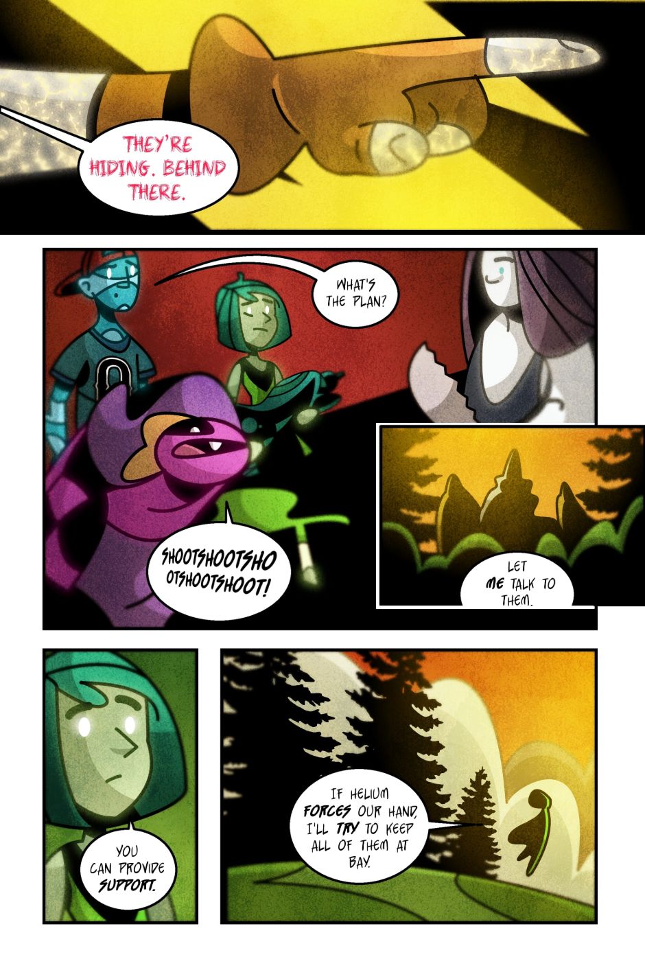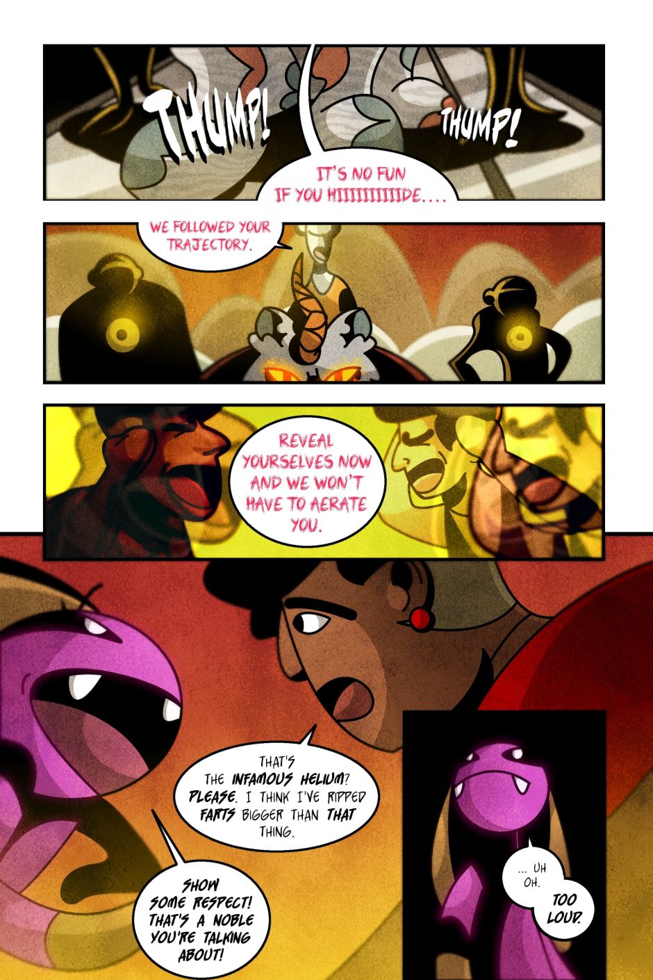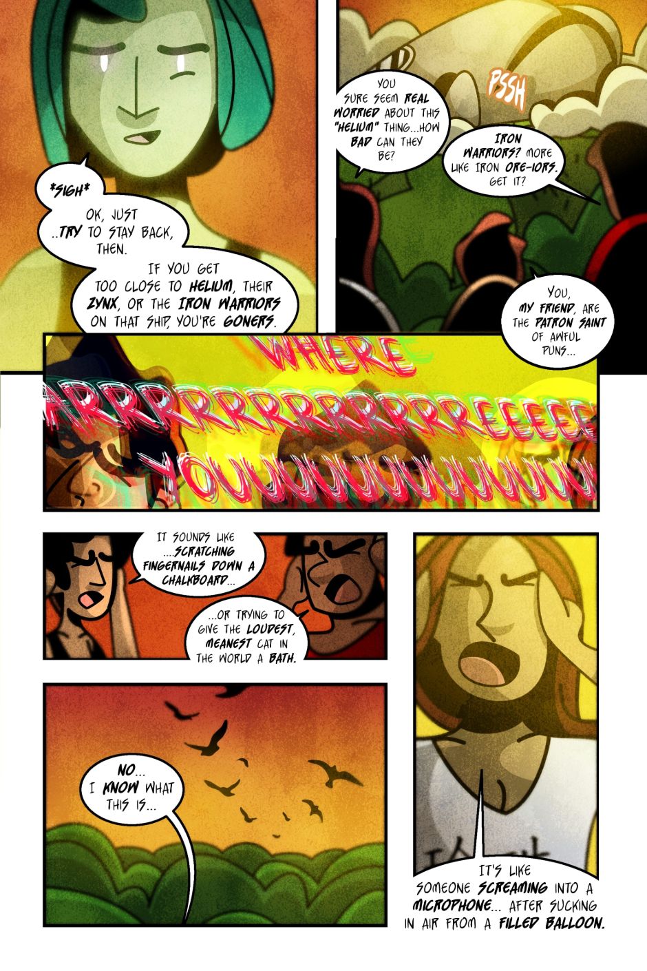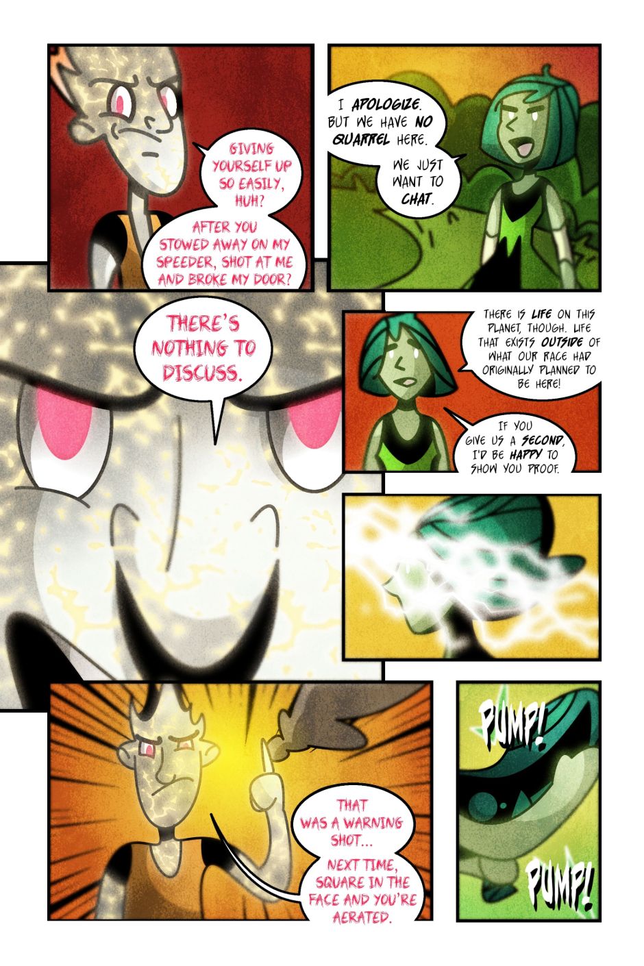The team is ill-equipped to fight, but Helium's not messing around. Some of my favorite banter is in this chapter, along with the choice to have Helium's font be a completely different color and style than any other speaking text...this will be consistent throughout the comic.