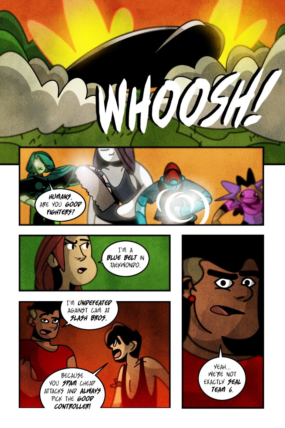 Cam, Hunter, and Mairead are enjoying their summer vacation when four alien Elements crash land on Earth with a message -- their planet is doomed unless the sinister Noble Gases are stopped! However, the humans have a secret weapon on their side which may give them the upper hand in this intergalactic battle. Now, this motley group of seven has to save BOTH of their planets - will they succeed? Updates every Tuesday at 5 PM PST. Story by Ethan Hammerman, art by Lee Milewski.