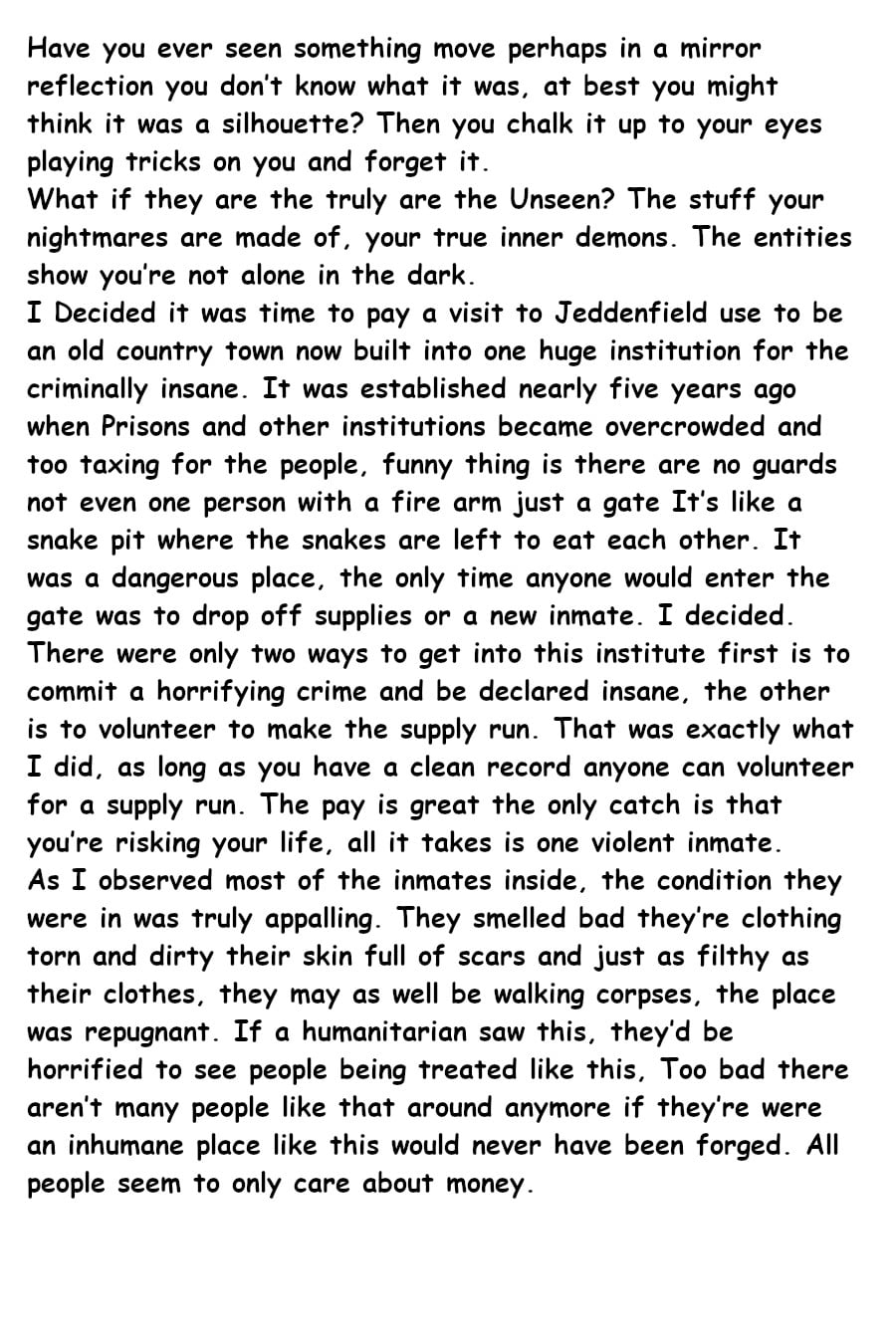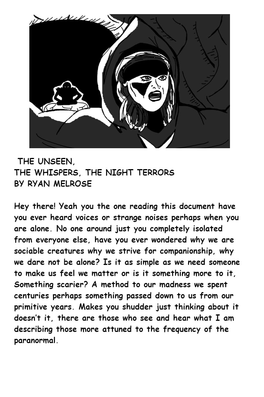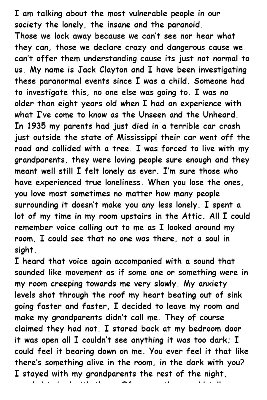 Have you ever heard voices in your head when you are all alone, have you ever felt there was someone in the room with you even though you couldn't see them, Hearing what sounded like strange movement, feel something pulling at your bed sheets when your alone in the dark. Jack Clayton is one of those individual and has dedicated his life to solving the mystery on what exactly lives in the dark and his obsession leads him into a world of trouble. can his wits get him out of trouble or will be the victim of certain doom.