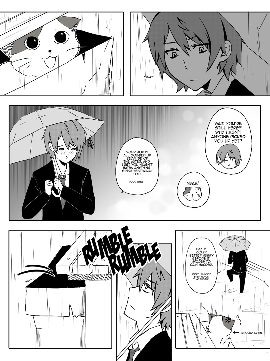 Shinji, a young man struggling with life's daily peers meets his match after encountering a stray cat on his way home from work. He rescues the cat from the rain with the intention of putting it back after the rain stops. But little does he know that the tiny feline might have actually saved him instead.