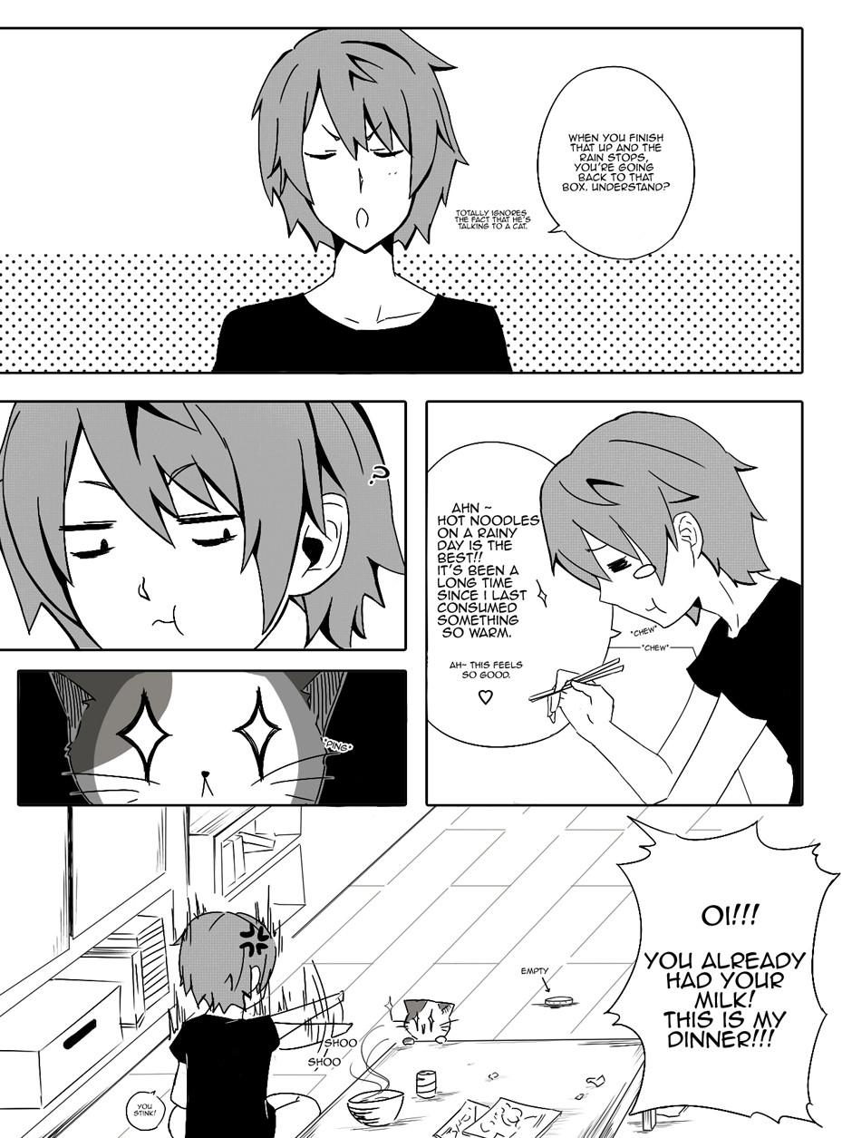 Shinji, a young man struggling with life's daily peers meets his match after encountering a stray cat on his way home from work. He rescues the cat from the rain with the intention of putting it back after the rain stops. But little does he know that the tiny feline might have actually saved him instead.