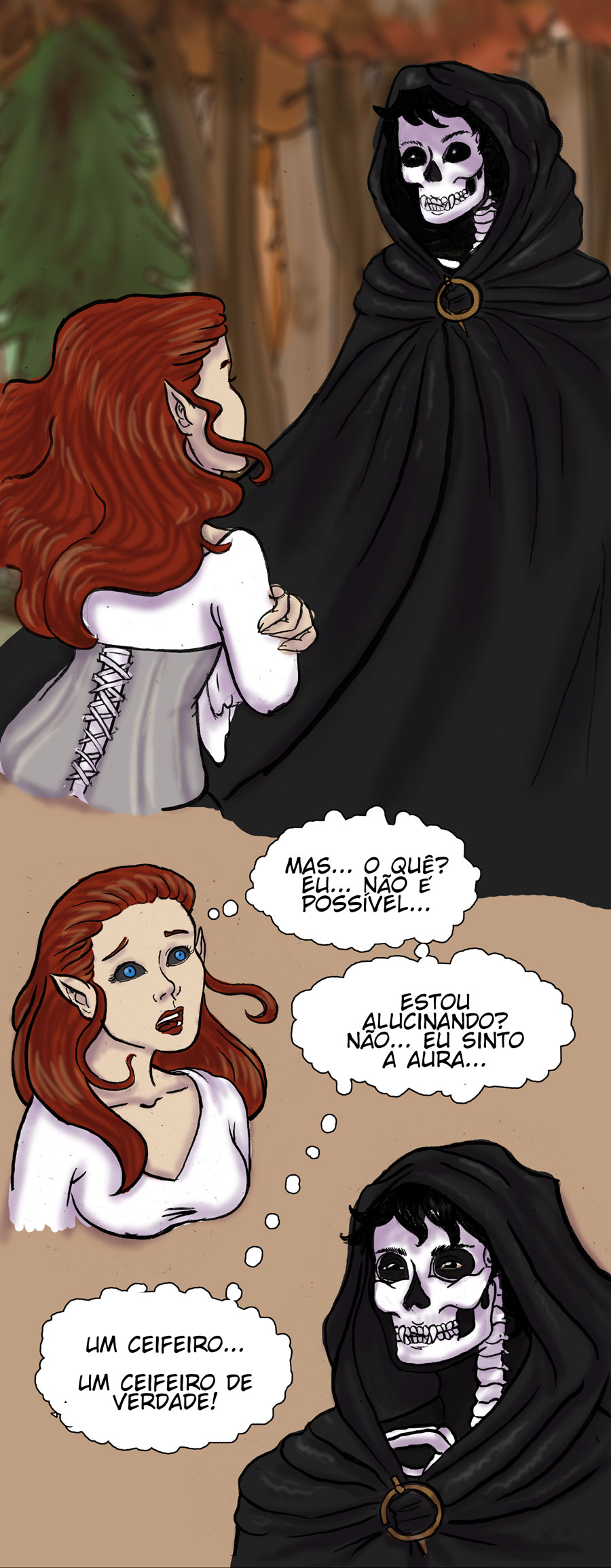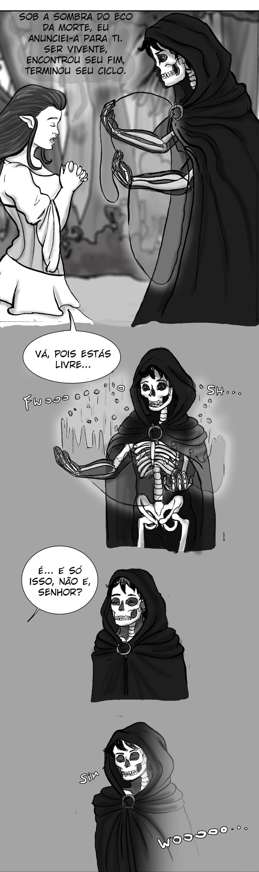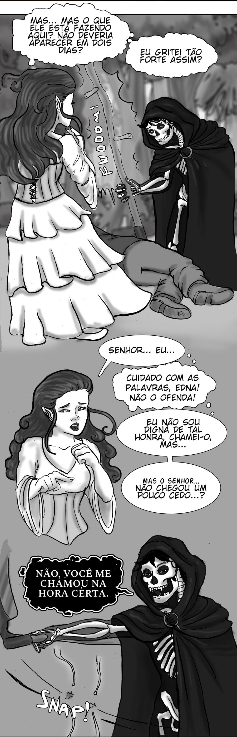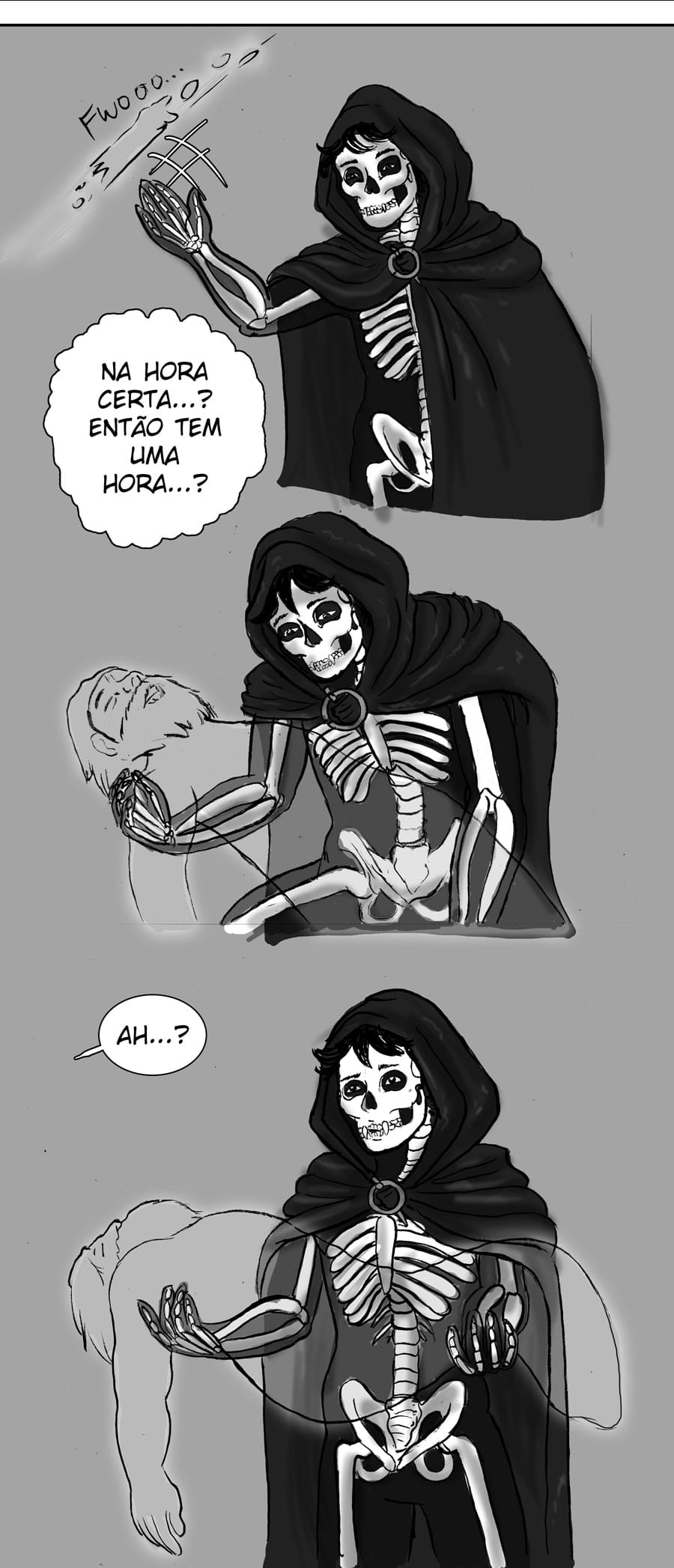 Ver a alma do velho fez algo passar pela minha cabeça. Esse design no mínimo curioso do Ceifeiro não é porque esse usa uma fantasia ou algo do tipo, mas sim porque a única coisa sólida nele são seus ossos, e a parte que parecem as bordas de seu corpo provavelmete são sua alma, embora talvez eu esteja indo meio longe com isso kk. Esse negócio seja tentar fazer algo pelos mortais me preocupa, o trabalho dela é só anunciar a morte, certo? Me lembra Death Note, aquela regrinha sobre os Deuses da Morte de não pode agir por um humano. Outra coisa, é bizarro ver a mãe dela querendo usar os moribundos somente pra treinar, imagino que pra uma banshe seja algo normal, mas se é mesmo, o que teria feito a protagonista ter um senso diferente?