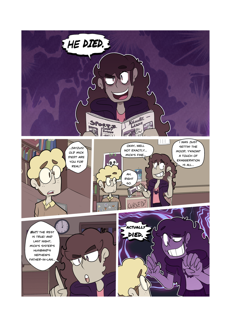 Kilscully Paranormal Club is the story of two paranormal investigators in a quiet, rural town in the midlands of Ireland. As they go looking for banshees, púcaí and more, they start to find that there's more going on in sleepy Kilscully than meets the eye! Can our heroes brave the ghosts of ancient Ireland? Or will they join the haunted masses they hope to investigate? Find out and read Kilscully Paranormal Club today!