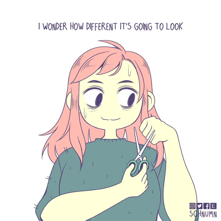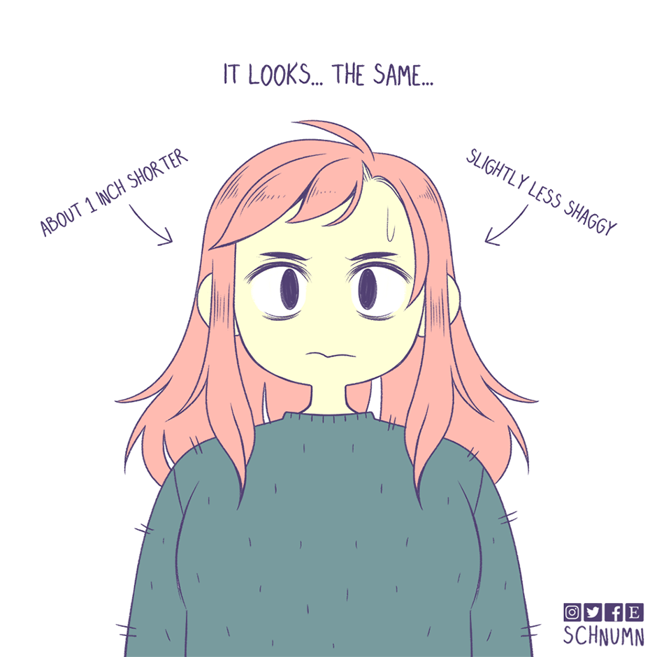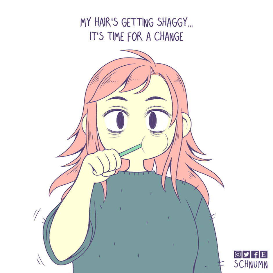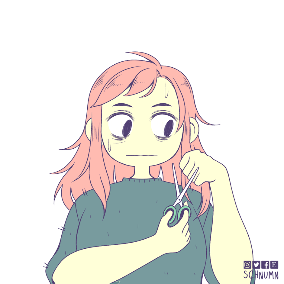 Fun fact! I haven't been to an actual hairdresser in over a decade because they stress me out and make me anxious :3 The thought of having to be stuck in a chair while making small talk with a stranger as they touch me is a big nope from me :')