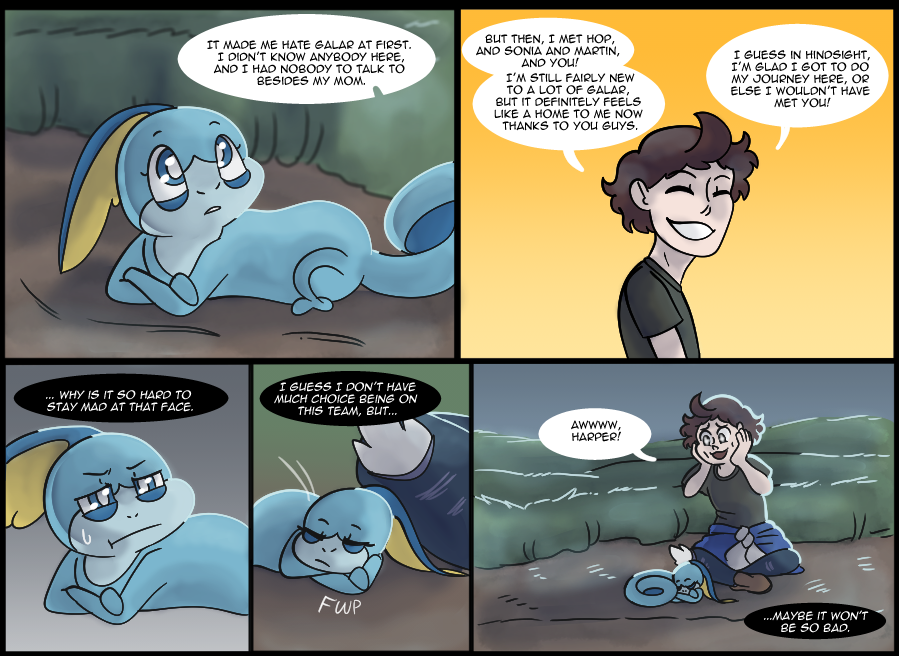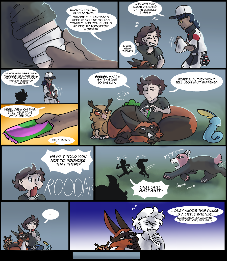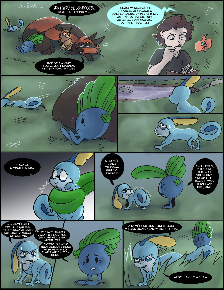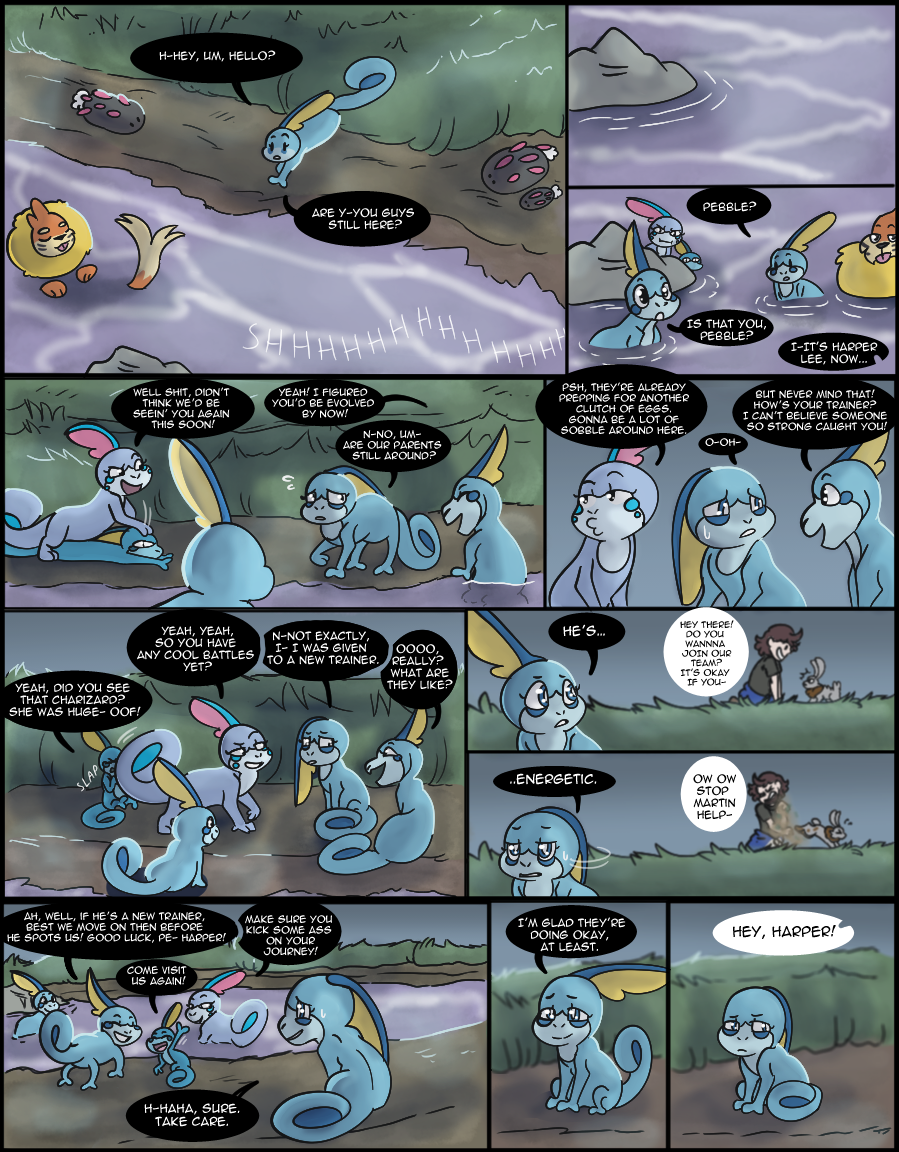 -A lot of people caught the mention of Harper's family on page 6, and here's the payoff! Harper's siblings are loosely based on the veiled chameleon (which is what Sobble's design was based off) as they breed more than once a year. I majorly lessened the number of eggs laid, though, because I'm not drawing 80+ siblings in Harper's clutch, haha. I know Sobble don't technically exist in the wild in the games but I mean, Leon had to get those starters from somewhere right?