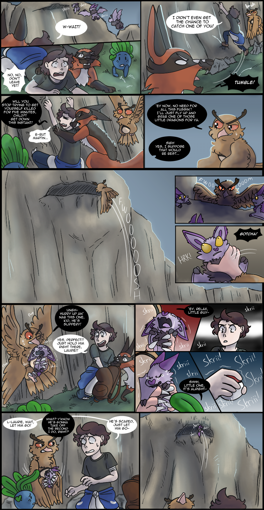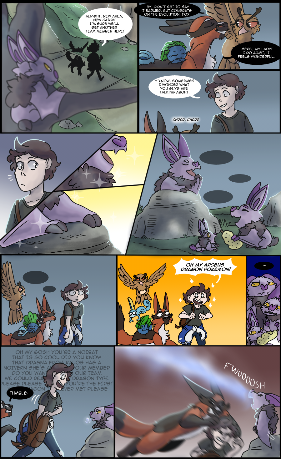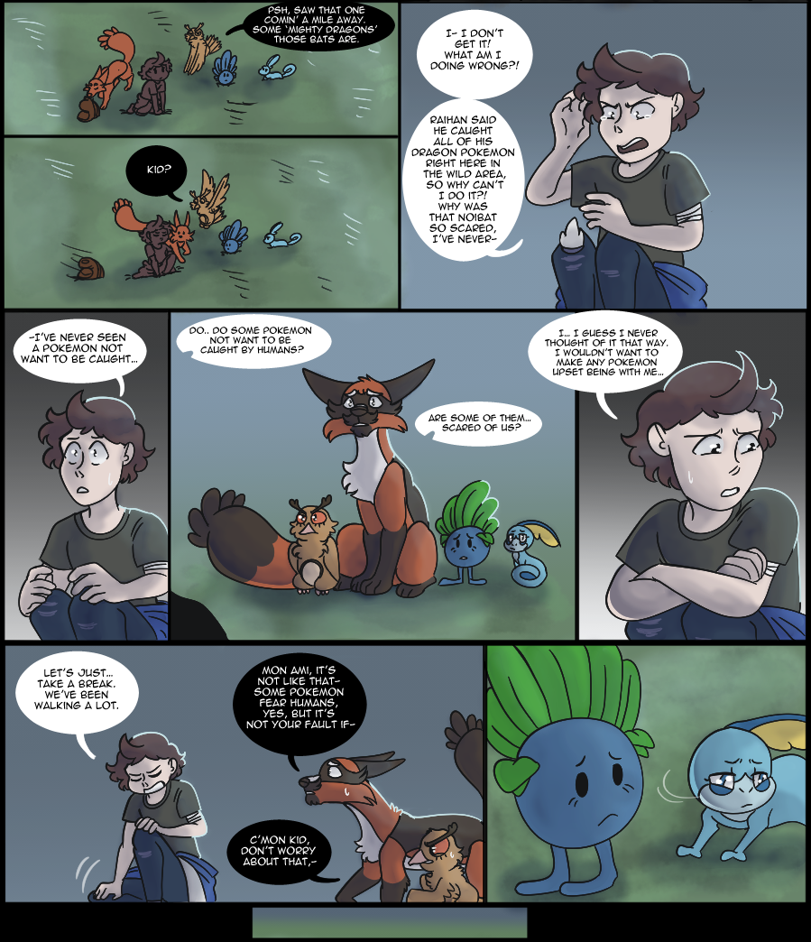 -A lot of people caught the mention of Harper's family on page 6, and here's the payoff! Harper's siblings are loosely based on the veiled chameleon (which is what Sobble's design was based off) as they breed more than once a year. I majorly lessened the number of eggs laid, though, because I'm not drawing 80+ siblings in Harper's clutch, haha. I know Sobble don't technically exist in the wild in the games but I mean, Leon had to get those starters from somewhere right?