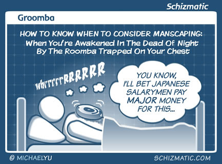 Roombas aren't designed for deep pile, and they definitely aren't designed for pubes. Learned THAT the hard way... Image: http://schizmatic.com/files/groomba.jpg Page: http://schizmatic.com/comics/301 Schizmatic: A Webcomic Of Intelligent Weirdness On Facebook: http://www.facebook.com/schizmatics On Twitter: https://twitter.com/schizmatic_ Store: http://schizmatic.com/store Archive: http://schizmatic.com/archive