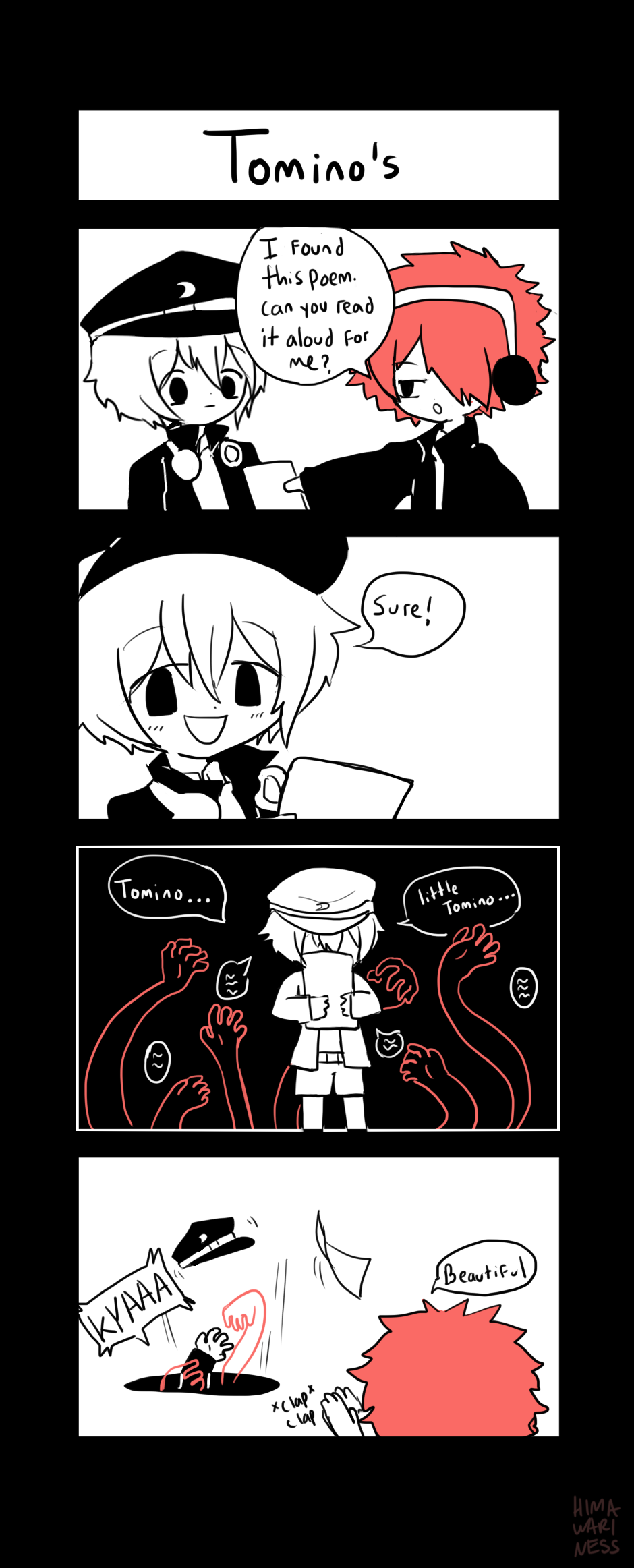 A spooky slapstick comic following the school life of students Mayonaka and Kakurenbo.