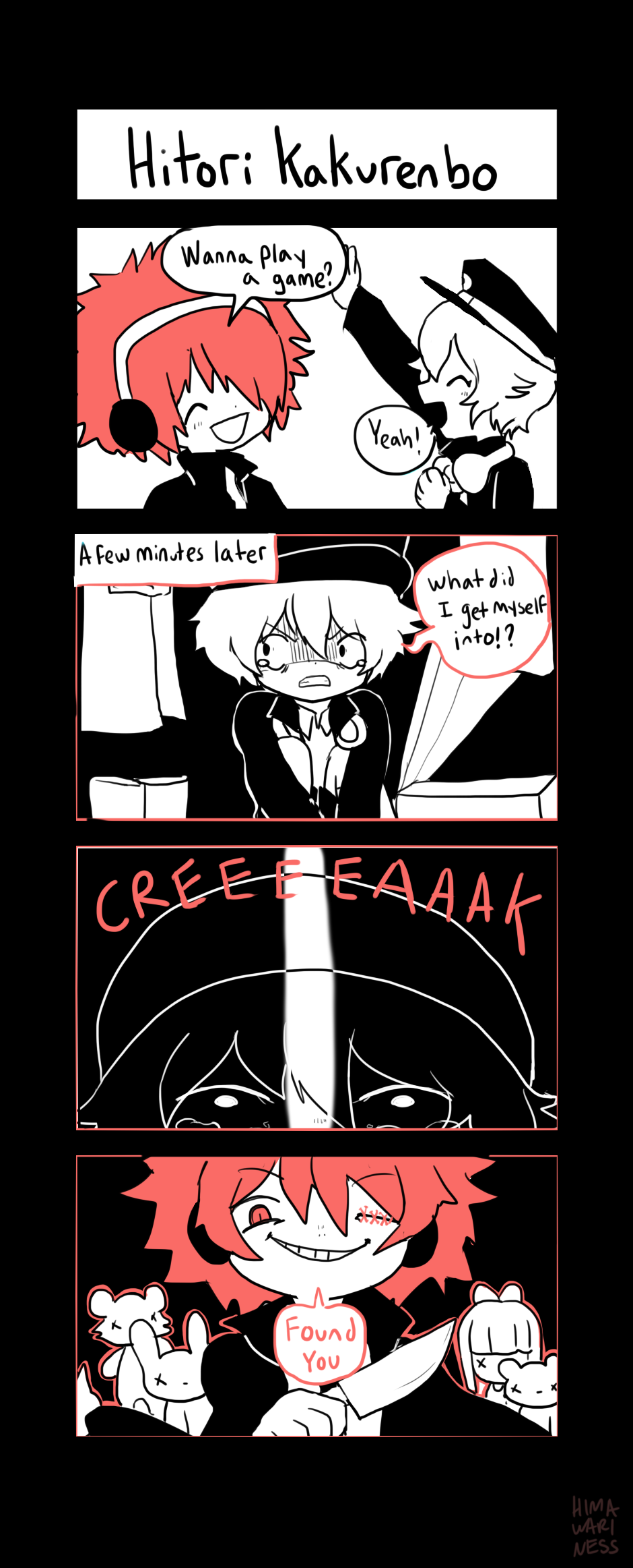 A spooky slapstick comic following the school life of students Mayonaka and Kakurenbo.