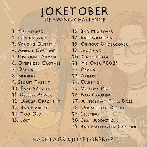 Hey all! I just wanted to add the artwork I'm doing for this month's challenge Joketober 2020! Attached is also the prompts for the whole month. I decided I will post these drawings using all characters from Open Flame! Please enjoy they were fun to make! You will see these drawings sprinkled through out this month! Love you all, Kiab