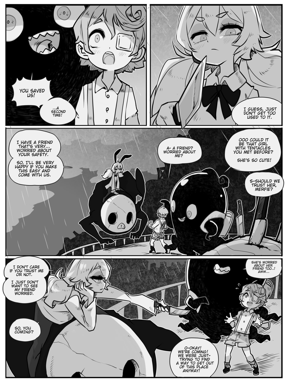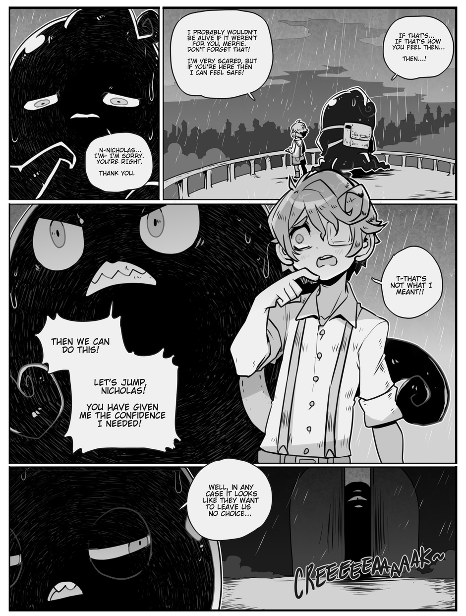 The story begins where Aria and Nicholas, very confused, meet Merfie, a monster that welcomes them to his home.