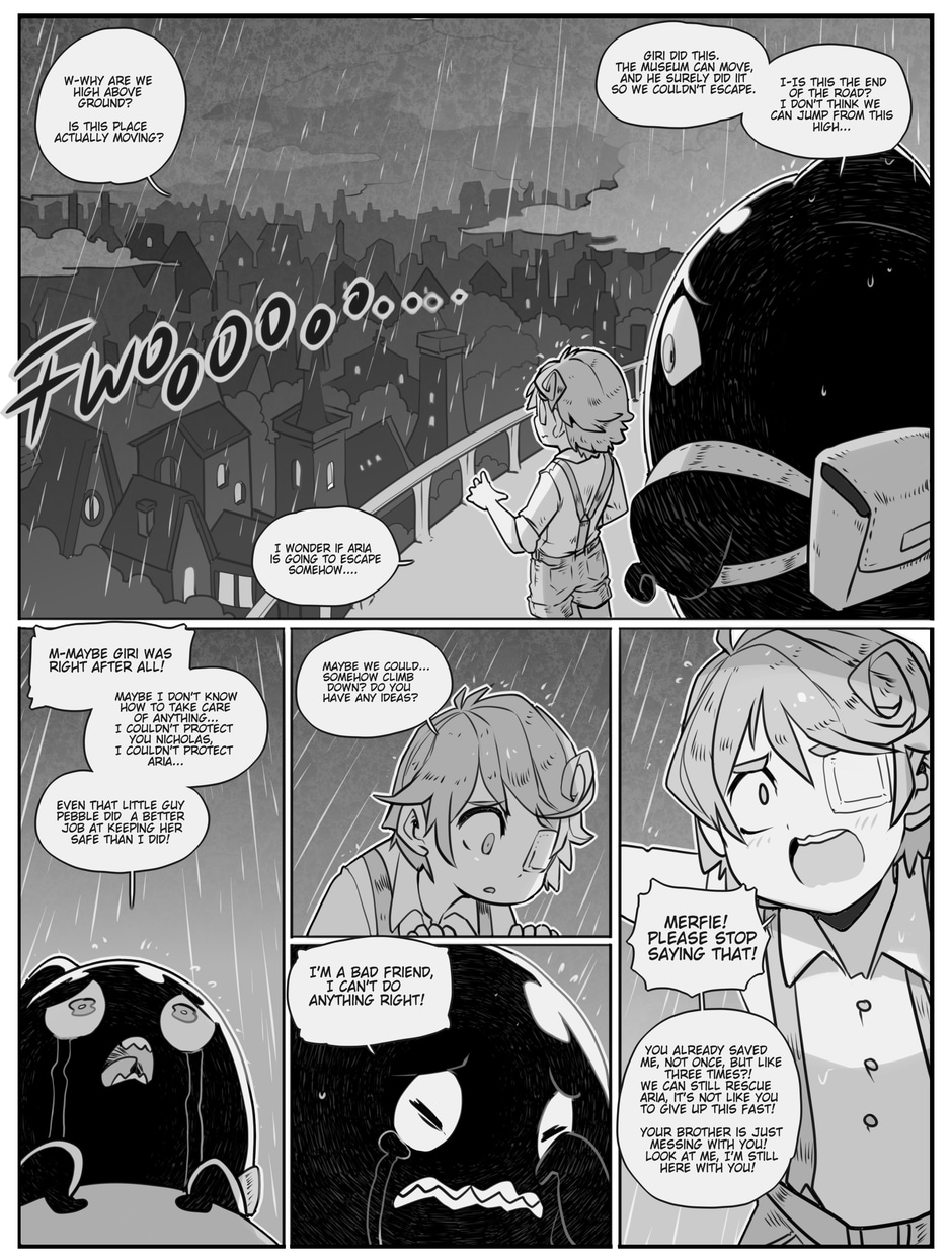 Nicholas and Merfie reach a similar scenario. The museum has risen and jumping off is.. complicated.