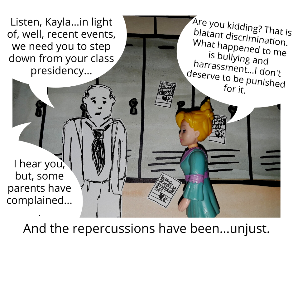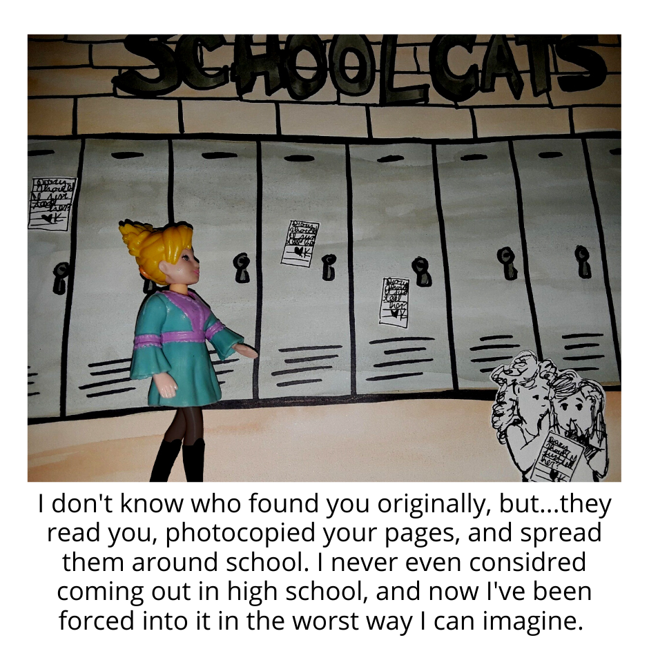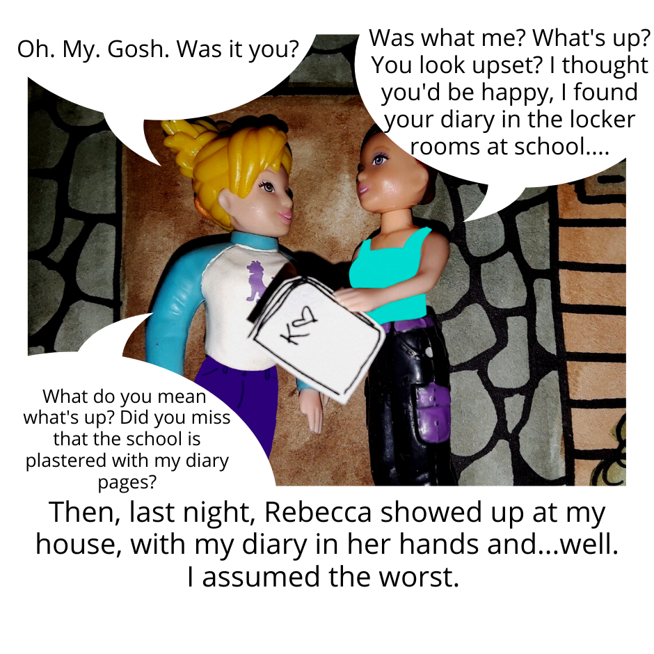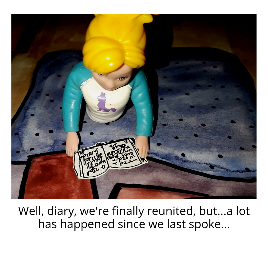 This comic is composed of...hand painted, water color + ink pen back grounds, pen on paper illustrated props, Fashion Polly Pockets (circa 2002), staged and photographed, with some digital art additions (mostly shirts), formatted with Canva. Just in case you're curious about process!