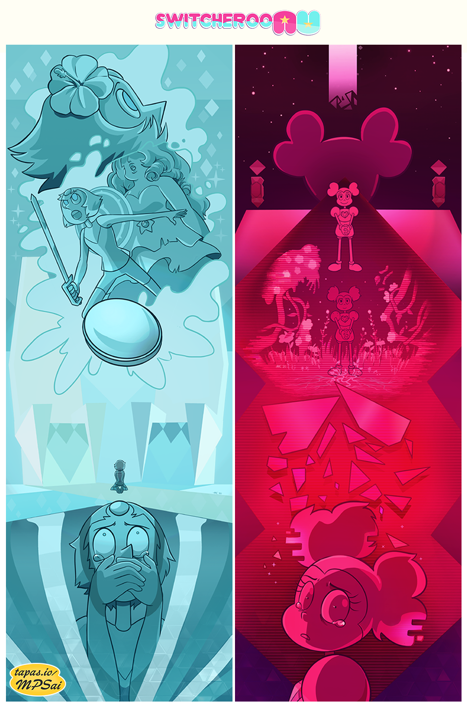 The Switcheroo AU is a fan project that imagines Spinel and Pearl's roles swapped in the story of Steven Universe, with the focus on Spinel as a Crystal Gem throughout the show's canon timeline.