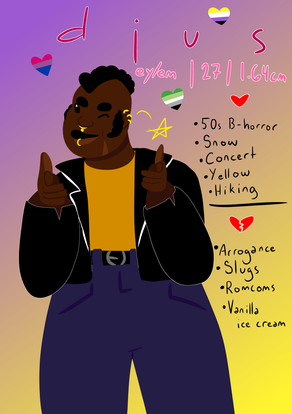Ey's non-binary, aro-bi, and best friends with Baz. Ey works in a cafe/bar known only as The Place, or The Squiggle. Ey's a social butterfly, and hates being alone: ey is the type to always know someone who knows someone. Djus enjoys a good flirt, and will not hesitate to put you in your place if you're out of line.