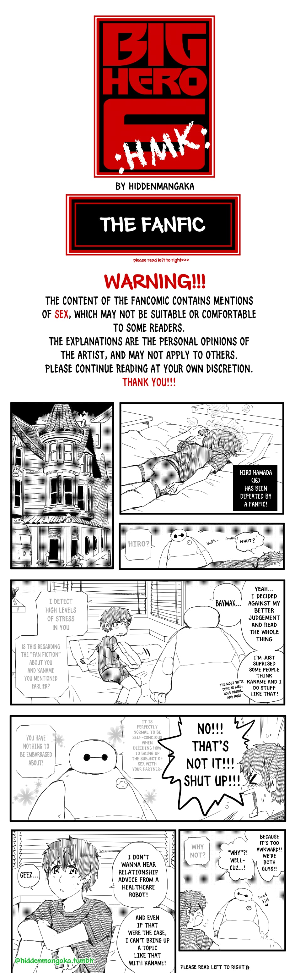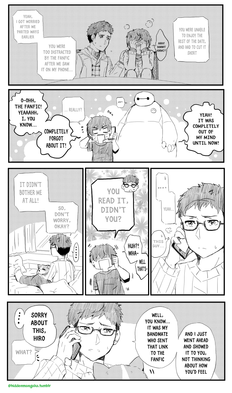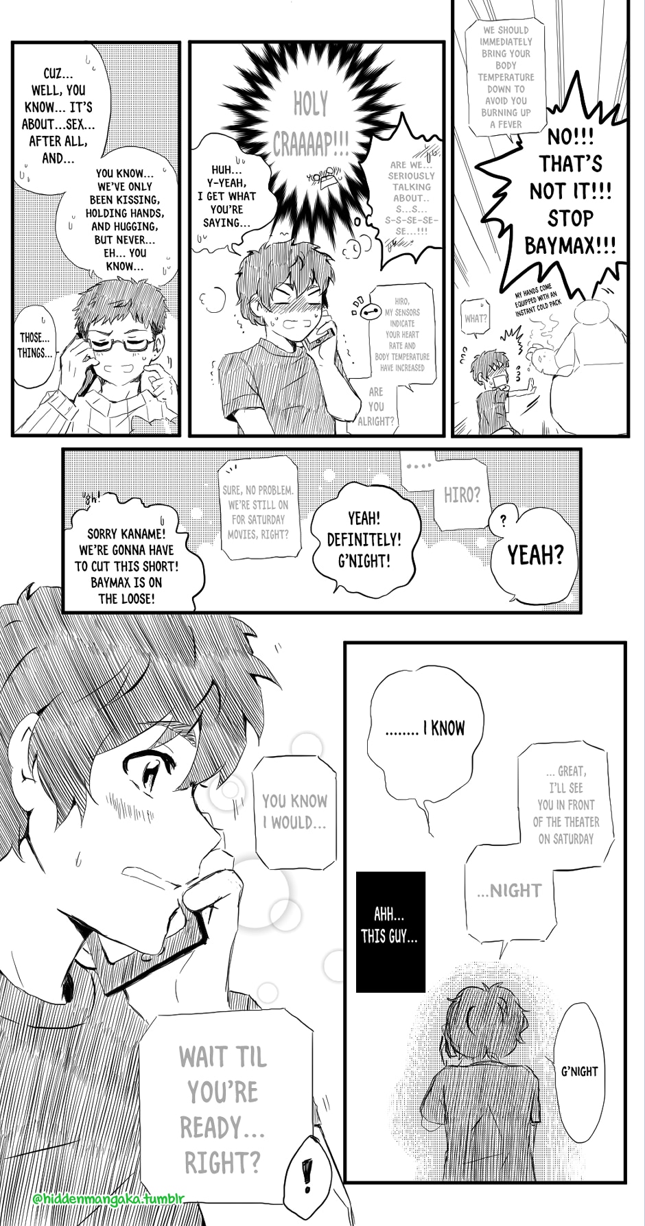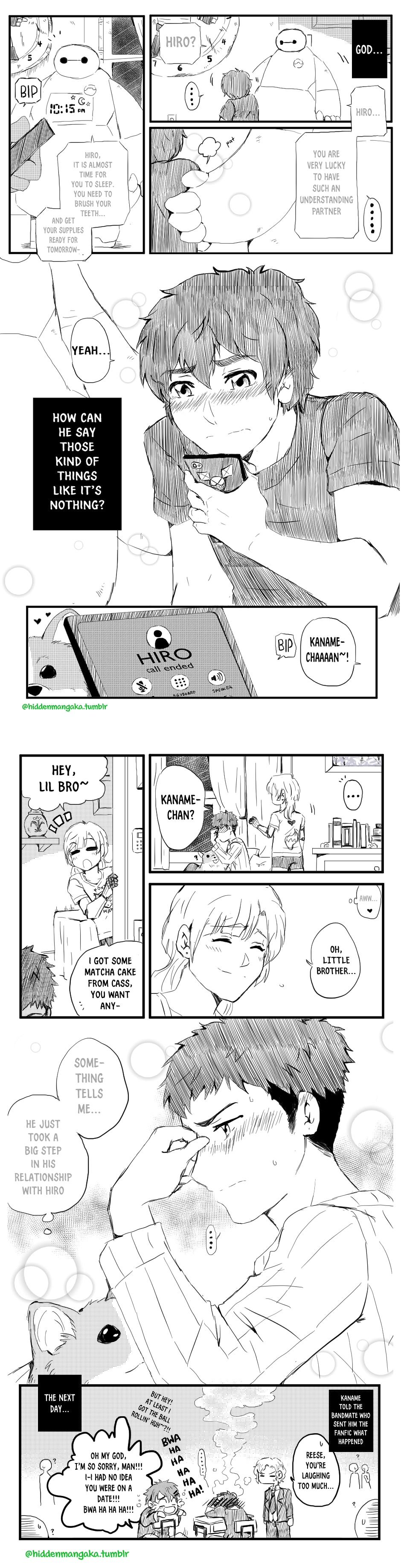 Events take place after Hiro reads the fanfic; Baymax gives him his version of “The Talk,” and Kaname calls Hiro to discuss the subject