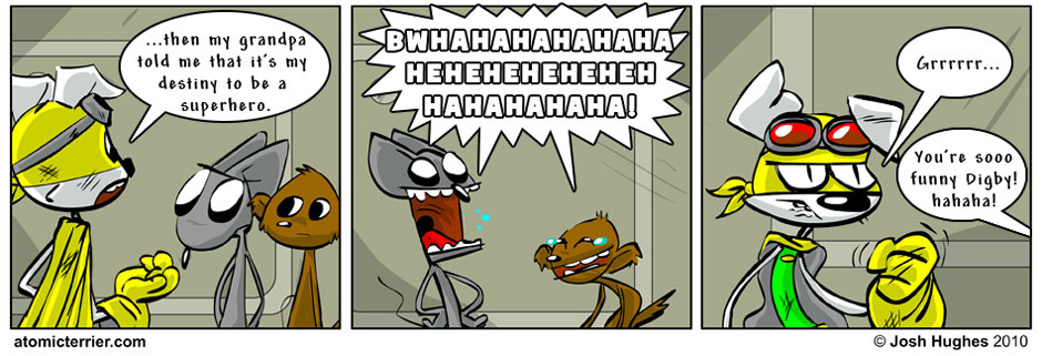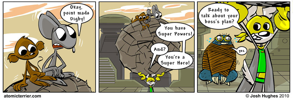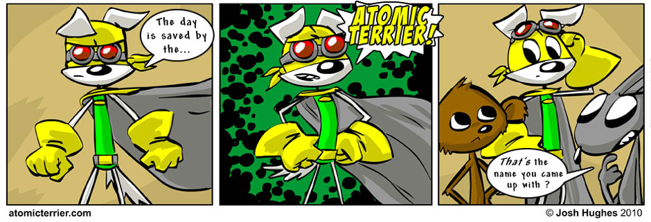 After finding out that his grandfather was a superhero in a great war against evil aliens, Digby was also told that he too was gifted with superpowers. He gladly took on the role of Atomic Terrier to defend the spaceport Diode city. Atomic Terrier has a a lot to live up to and much to learn.