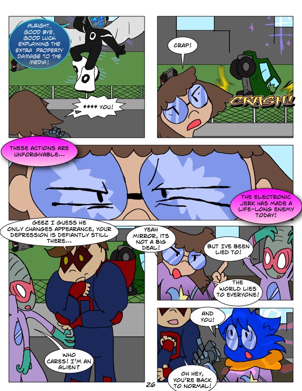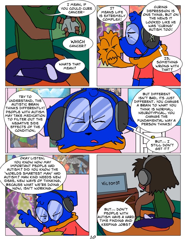 In Manic! Autistic Superhero! Characters wear there disabilities right out for the world to see, but that doesn't make them any less discriminated. Even though disabilities become physical traits in this world, (such as depression becoming a strangling scarf who speaks your depressive and aggressive thoughts) They aren't all obvious or easily brushed off. Autism appears differently for every person, and can appear slightly or very extremely. Other disabilities only appear sometimes, arthritis and diabetes are only visible when they become a problem.